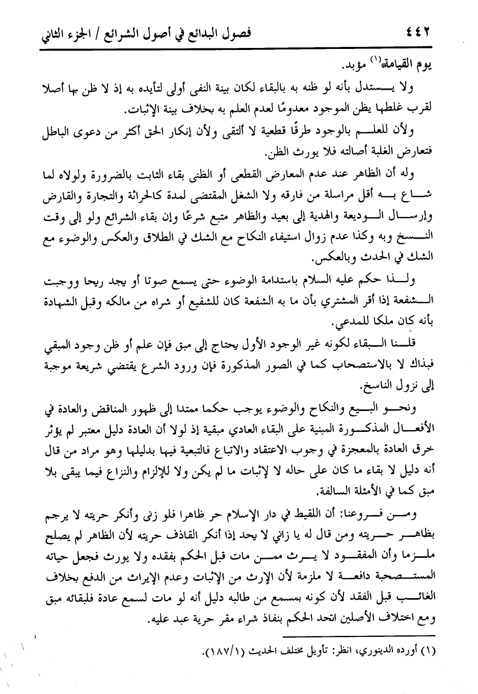 ونحو البيع والنكاح والوضوء يوجب حكمًا ممتدا إلى ظهور المناقض والعادة في الأفعال المذكورة المبنية على البقاء العادي مبقية إذ لولا أن العادة دليل معتبر لم يوثر خرق العادة بالمعجزة في وجوب الاعتقاد والاتباع فالتبعية فيها بدليلها وهو مراد من قال أنه دليل لا بقاء ما كان على حاله لا لإثبات ما لم يكن ولا للإلزام والنزاع فيما يبقى بلا مبق كما في الأمثلة السالفة.