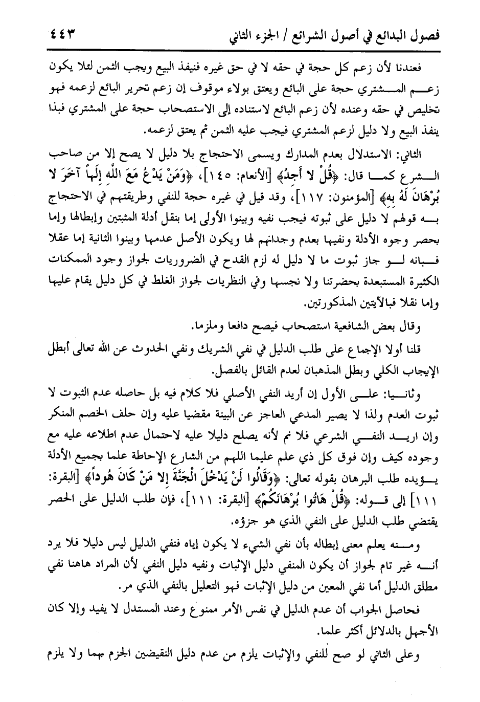 وثانيا: على الأول إن أريد النفي الأصلي فلا كلام فيه بل حاصله عدم الثبوت لا ثبوت العدم ولذا لا يصير المدعي العاجز عن البينة مقضيا عليه وإن حلف الخصم المنكر وإن أريد النفي الشرعي فلا ثم لأنه يصلح دليلًا عليه لاحتمال عدم اطلاعه عليه مع وجوده كيف وإن فوق كل ذي علم عليما اللهم من الشارع الإحاطة علمًا بجميع الأدلة يويده طلب البرهان بقوله تعالى: {وَقَالُوا لَنْ يَدْخُلَ الْجَنَّةَ إِلَّا مَنْ كَانَ هُودًا} [البقرة: 111] إلى قوله: {قُلْ هَاتُوا بُرْهَانَكُمْ} [البقرة: 111]، فإن طلب الدليل على الحصر يقتضي طلب الدليل على النفي الذي هو جزؤه.