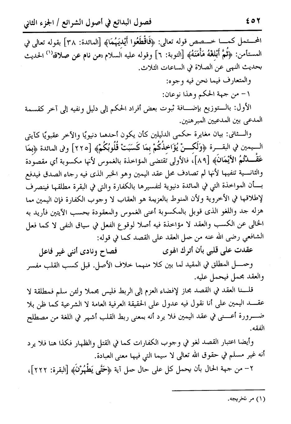 والثاني: بيان مغايرة حكمى الدليلين كأن يكون أحدهما دنيويًا والآخر عقبويًا كآيتى اليمين في البقرة {وَلَكِنْ يُؤَاخِذُكُمْ بِمَا كَسَبَتْ قُلُوبُكُمْ} [225] وفي {بِمَا عَقَّدْتُمُ الْأَيْمَانَ} [89]، فالأولى تقتضى المؤاخذة بالغموس لأنها مكسوبة أي مقصودة والثانية تنفيها لأنها لم تصادف محل عقد اليمين وهو الخبر الذي فيه رجاء الصدق فيدفع بأن المواخذة التي في المائدة دنيوية لتفسيرها بالكفارة والتي في البقرة مطلقها فينصرف لإطلاقها في الأخروية ولأن المنوط بالعزيمة هو العقاب لا وجوب الكفارة فإن اليمين مما هزله جد واللغو الذي قوبل بالمكسوبة أعني الغموس والمعقودة بحسب الآيتين فأريد به الخالي عن الكسب والعقد لا مؤاخذة فيه أصلًا لوقوع الفعل في سياق النفي لا كما فعل الشافعي رضي الله عنه من حمل العقد على القصد كما في قوله: