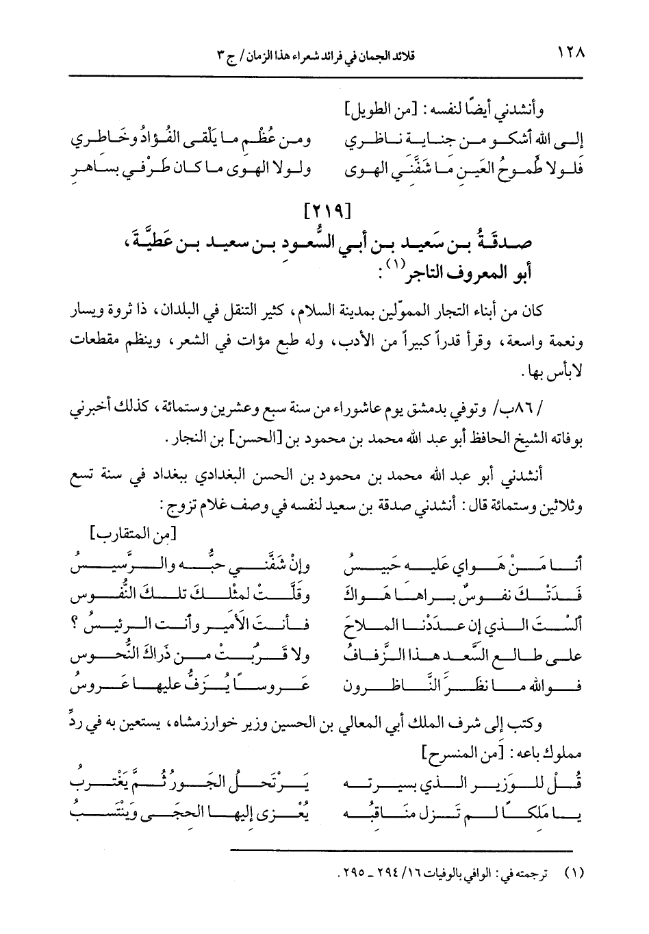 أنشدني أبو عبد الله محمد بن محمود بن الحسن البغدادي ببغداد في سنة تسع وثلاثين وستمائة قال: أنشدني صدقة بن سعيد لنفسه في وصف غلام تزوج: