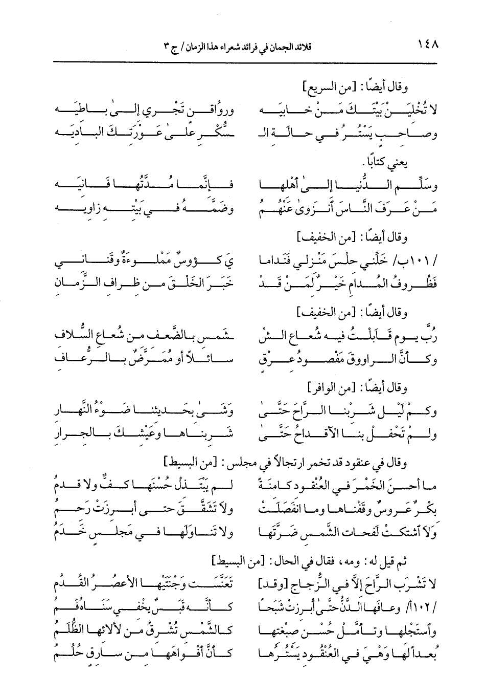 /101 ب/ خلَّني حلس منزلي فنداما ... ي كؤؤس مملوءة وقناني