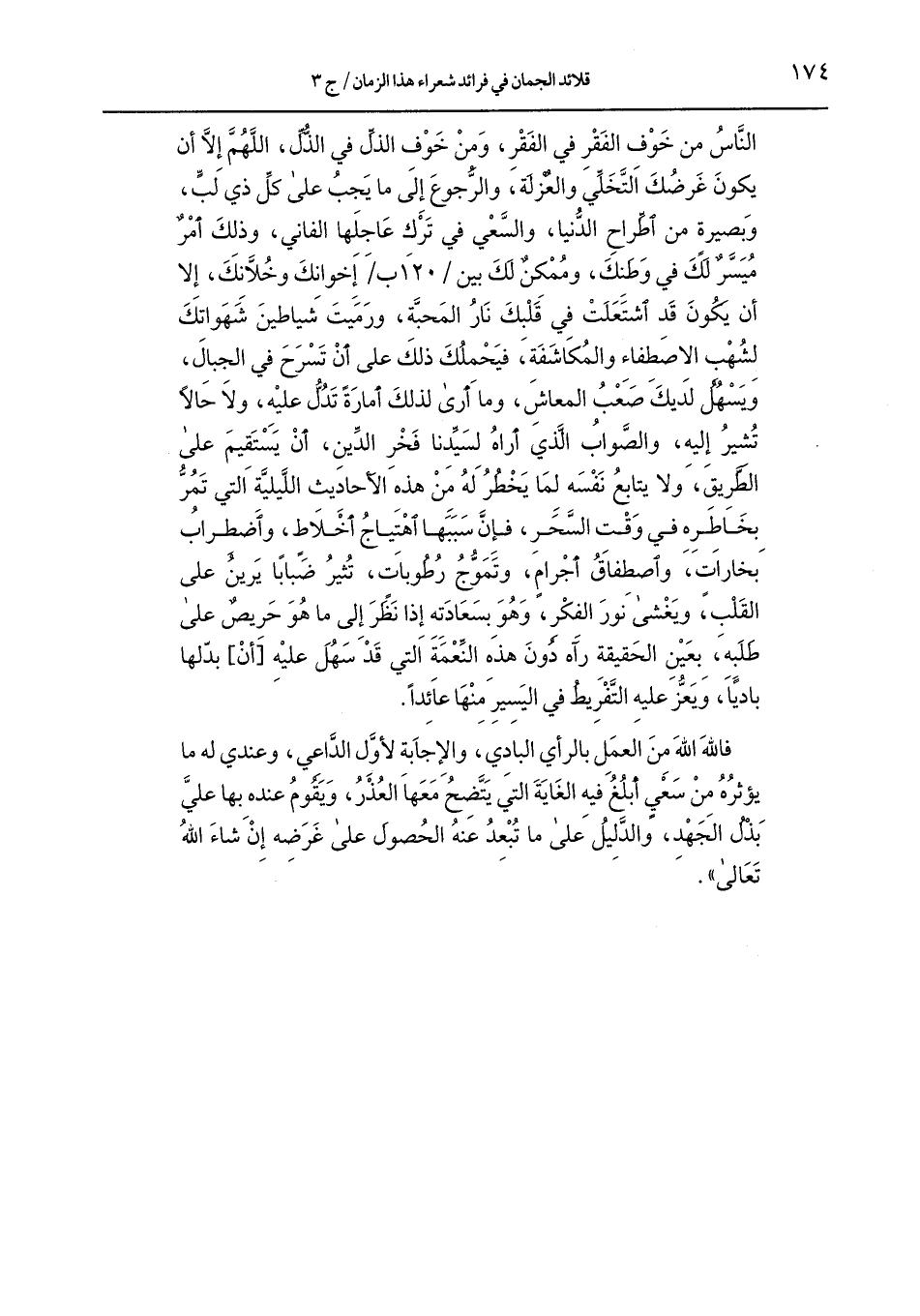 النَّاس من خوف الفقر في الفقر، ومن خوف الذلِّ في الذُّل، اللَّهمَّ إلاَّ أن يكون غرضك التَّخلِّي والعزلة، والرُّجوع إلى ما يجب على كلِّ ذي لبٍّ، وبصيرة من اطِّراح الدُّنيا، والسَّعي في ترك عاجلها الفاني، وذلك أمر ميسَّر لك في وطنك، وممكن لك بين / 120 ب/ إخوانك وخلاَّنك، إلا أن يكون قد اشتعلت في قلبك نار المحبَّة، ورميت شياطين شهواتك لشهب الاصطفاء والمكاشفة، فيحملك ذلك على أن تسرح في الجبال، ويسهل لديك صعب المعاش، وما أرى لذلك أمارة تدلُّ عليه، ولا حالاً تشير إليه، والصَّواب الَّذي أراه لسيِّدنا فخر الدِّين، أن يستقيم على الطَّريق، ولا يتابع نفسه لما يخطر له من هذه الأحاديث اللَّيليَّة التي تمرُّ بخاطره في وقت السَّحر، فإن سببها اهتياج أخلاط، واضطراب بخارات، واصطفاق أجرام، وتموج رطوبات، تثير ضبابًا يرين على القلب، ويغشى نور الفكر، وهو بسعادته إذا نظر إلى ما هو حريص على طلبه، بعين الحقيقة رآه دون هذه النِّعمة التي قد سهل عليه [أن] بدّلها باديًا، ويعزُّ عليه التَّفريط في اليسير منها عائدًا.