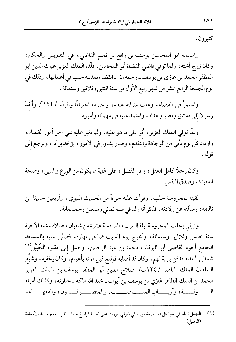 لقيته بمحروسة حلب، وقرأت عليه جزءًا من الحديث النبوي، وأربعين حديثًا من تأليفه، وسألته عن ولادته، فذكر أنه ولد في سنة ثماني وسبعين وخمسمائة.