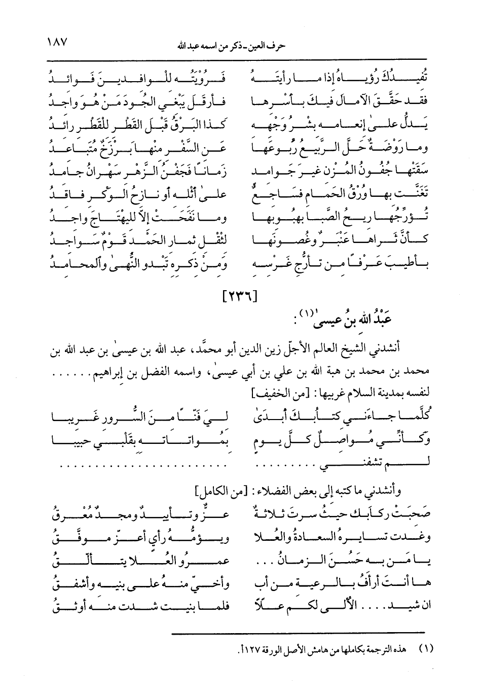 أنشدني الشيخ العالم الأجلّ زين الدين أبو محمَّد، عبد الله بن عيسى بن عبد الله بن محمد بن محمد بن هبة الله بن علي بن أبي عيسى، واسمه الفضل بن إبراهيم ...... لنفسه بمدينة السلام غربيها: [من الخفيف]
