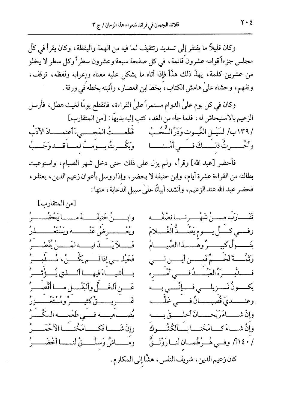 فأحضر [عبد الله] وقرأ، ولم يزل على ذلك حتى دخل شهر الصيام، واستوعبت بطالته من القراءة عشر أيام، وابن حنيفة لا يحضر، وإذا روسل بأعوان زعيم الدين، يعتذر، فحضر عبد الله عند الزعيم، وأنشده أبياتًا على سبيل الدعابة، منها: