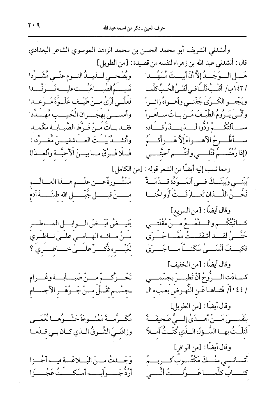 وأنشدني الشريف أبو محمد الحسن بن محمد الزاهد الموسوي الشاعر البغدادي قال: أنشدني عبد الله بن زهراء لنفسه من قصيدة: [من الطويل]