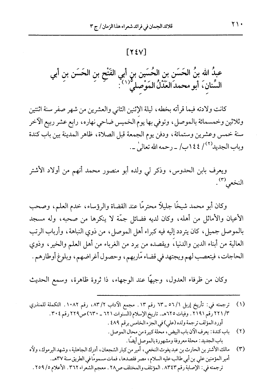 وكان أبو محمد شيخًا جليلاً محترمًا عند القضاة والرؤساء، خدم العلم، وصحب الأعيان والأماثل من أهله، وكان لديه فضائل جمّة لا ينكرها من صحبه، وله مسجد بالموصل جميل، كان يتردد إليه فيه كبراء أهل الموصل، من ذوي النباهة، وأرباب الرتب العالية من أبناء الدين والدنيا، ويقصده من يرد من الغرباء من أهل العلم والخير، وذوي الحاجات، فيتعصب لهم ويجتهد في قضاء مآربهم، وحصول أغراضهم، وبلوغ أوطارهم.