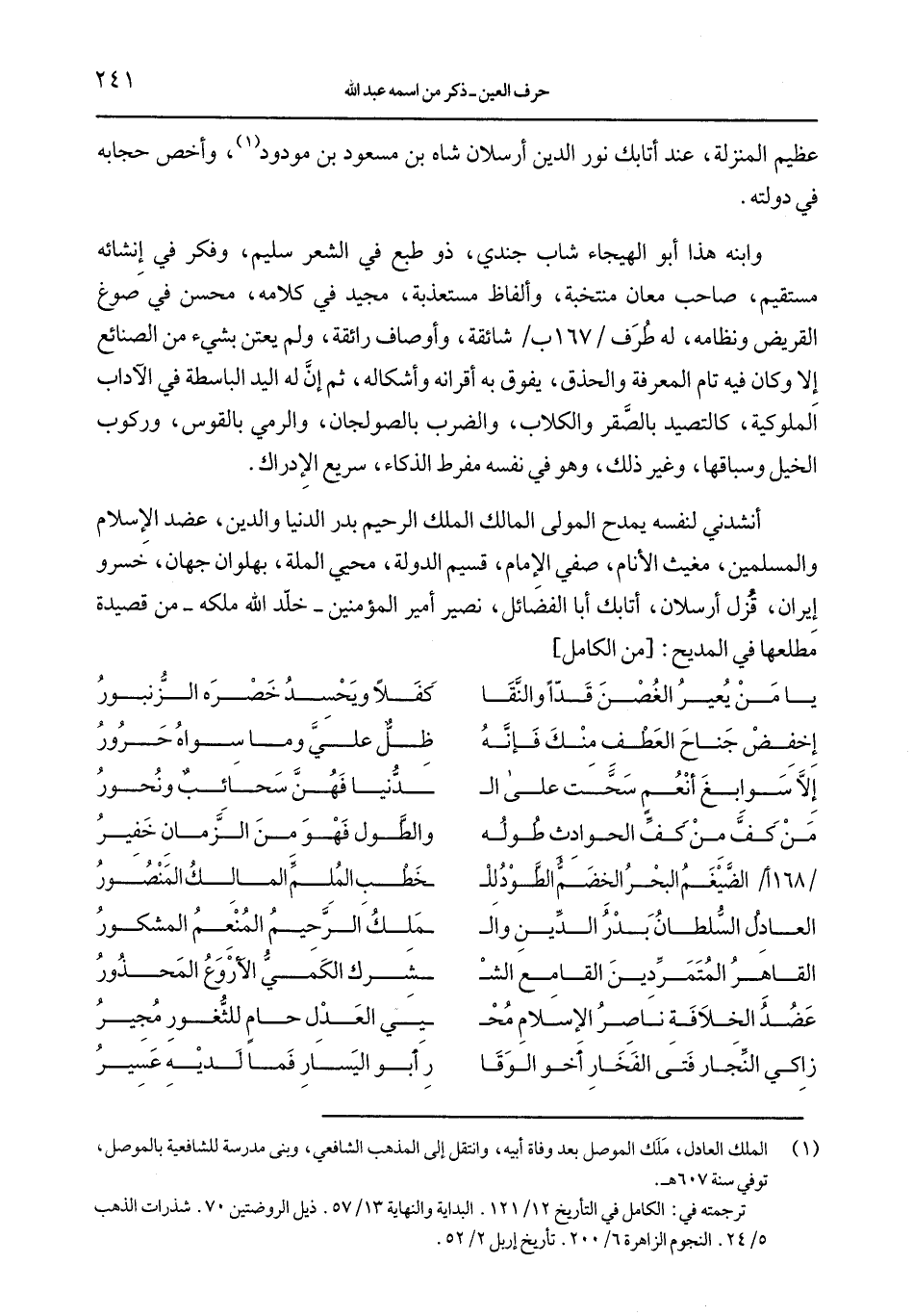 أنشدني لنفسه يمدح المولى المالك الملك الرحيم بدر الدنيا والدين، عضد الإسلام والمسلمين، مغيث الأنام، صفي الإمام، قسيم الدولة، محيي الملة، بهلوان جهان، خسرو إيران، قزل أرسلان، أتابك أبا الفضائل، نصير أمير المؤمنين -خلّد الله ملكه- من قصيدة مطلعها في المديح: [من الكامل]