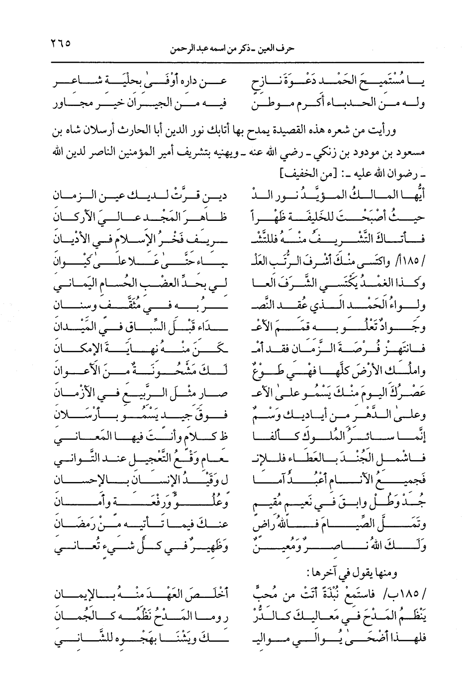 ورأيت من شعره هذه القصيدة يمدح بها أتابك نور الدين أبا الحارث أرسلان شاه بن مسعود بن مودود بن زنكي –رضي الله عنه- ويهينه بتشريف أمير المؤمنين الناصر لدين الله –رضوان الله عليه-: [من الخفيف]