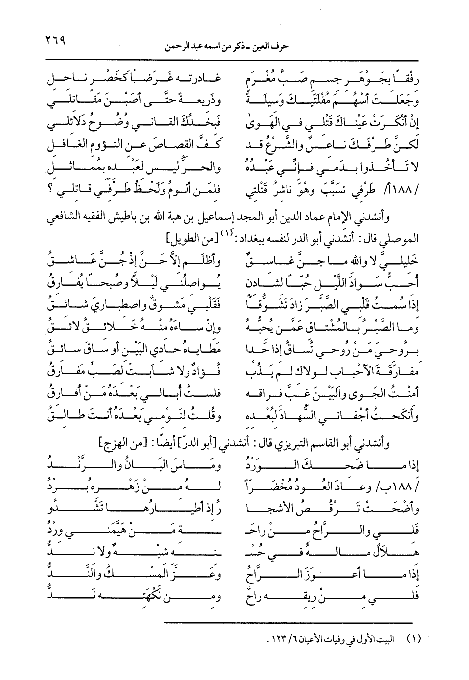 وأنشدني الإمام عماد الدين أبو المجد إسماعيل بن هبة الله بن باطيش الفقيه الشافعي الموصلي قال: أنشدني أبو الدر لنفسه ببغداد: [من الطويل]