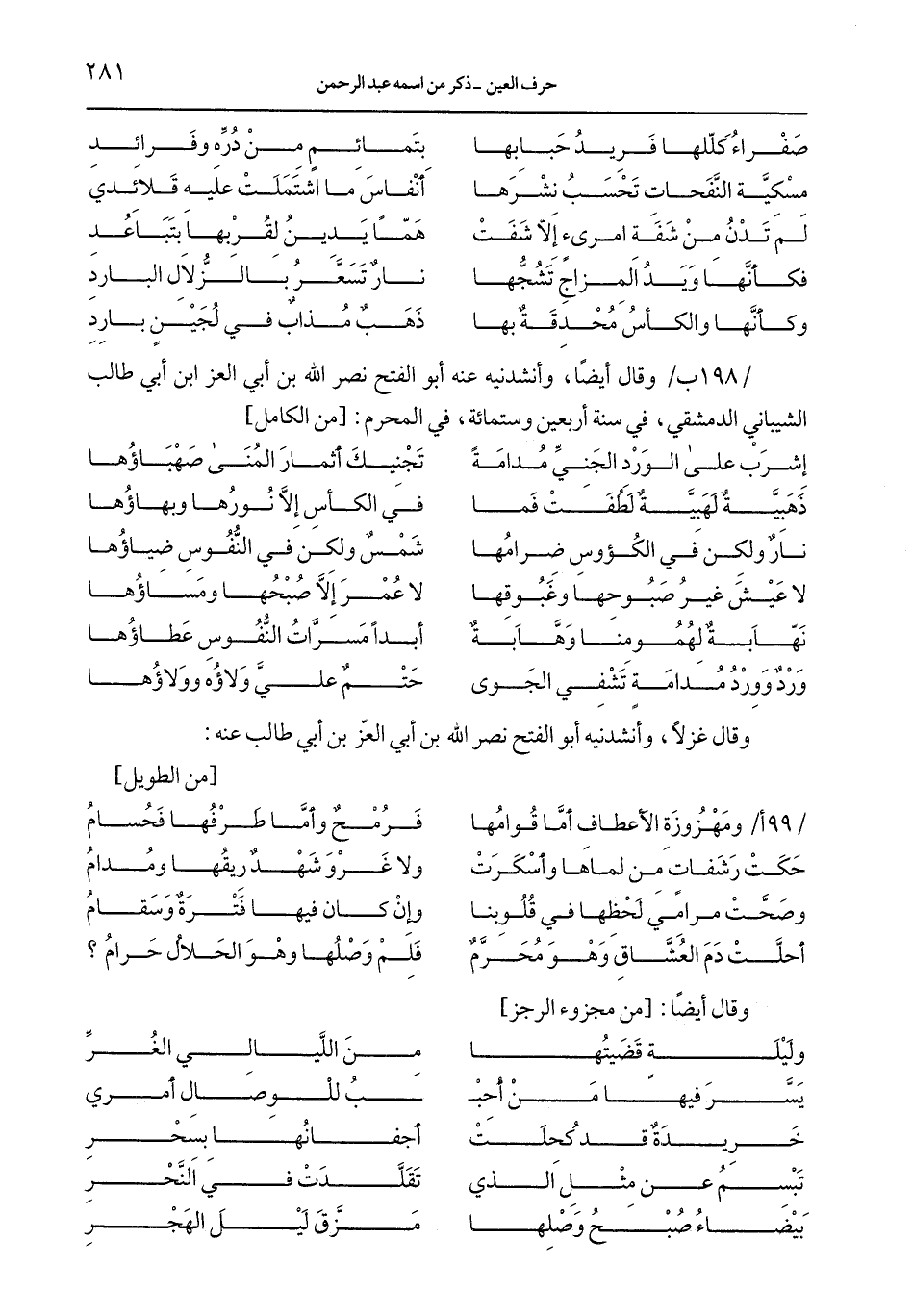 / 198 ب/ وقال أيضًا، وأنشدنيه عنه أبو الفتح نصر الله بن أبي العز ابن أبي طالب الشيباني الدمشقي، في سنة أربعين وستمائة، في المحرم: [من الكامل]
