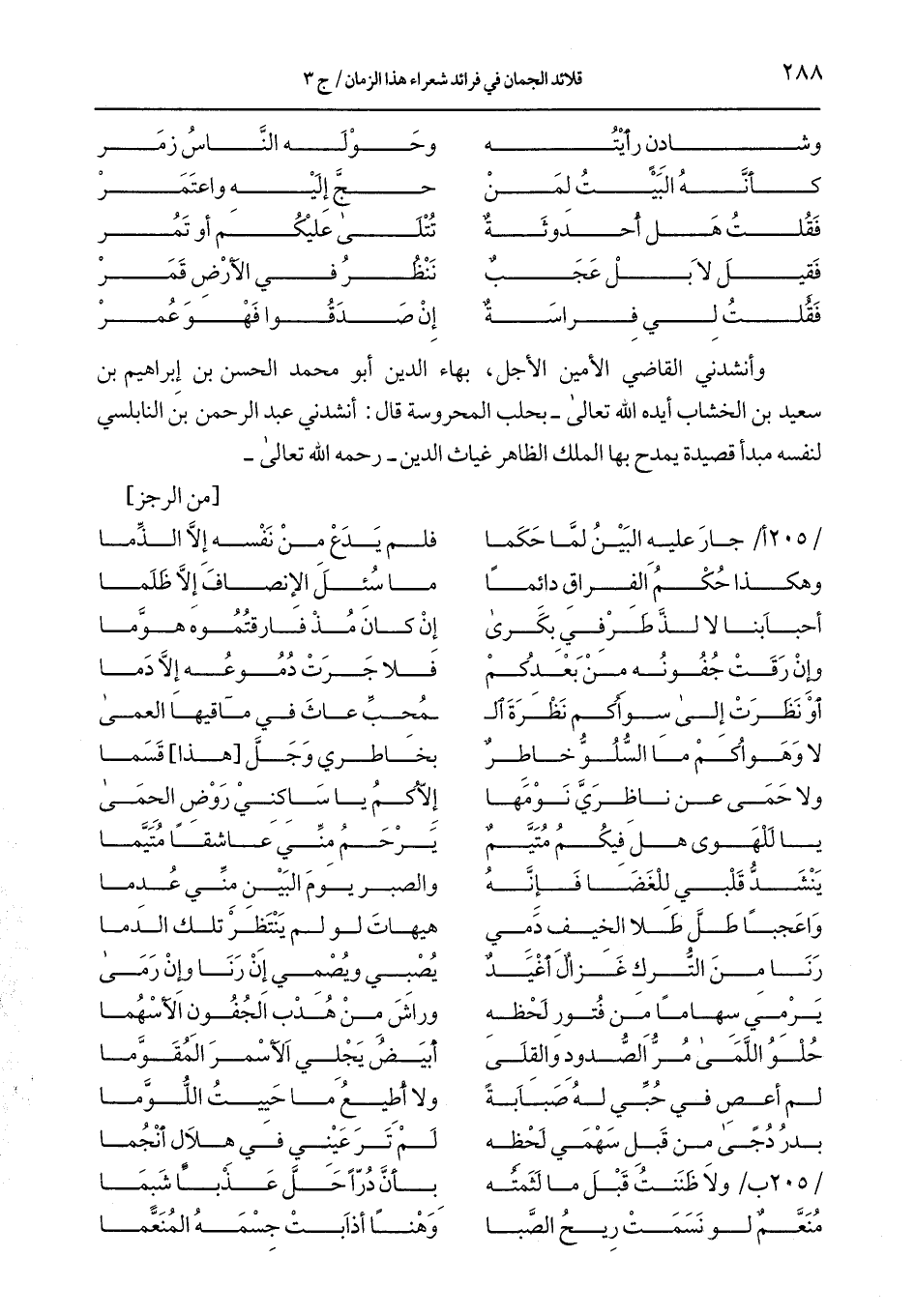 وأنشدني القاضي الأمين الأجل، بهاء الدين أبو محمد الحسن بن إبراهيم بن سعيد بن الخشاب أيده الله تعالى –بحلب المحروسة قال: أنشدني عبد الرحمن بن النابلسي لنفسه مبدأ قصيدة يمدح بها الملك الظاهر غياث الدين –رحمه الله تعالى-