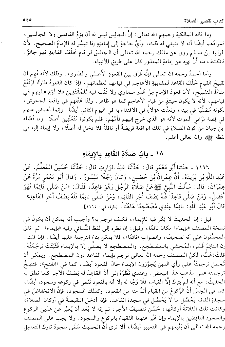 قيل: إن الحديثَ لا ذِكْر فيه للإِيماء، فكيف ترجم به؟ وأجيب أنه يمكن أن يكونَ في نسخة المصنف «بإيماء» مكان نائمًا، وقيل: إن نظره إلى لفظ النَّسائي وفيه «بإيماء». ثم اتفق المحدِّثون على أنه تصحيفٌ، والصواب «نائمًا»، فلا يمكن بناءُ الترجمة عليها أيضًا. فإن قلت: إن النائِمَ فَسَّره المُحشِّي بالمضطجع، والمضطجع لا يصلِّي إلا بالإيماء فَثَبَتْ ترجَمَتُهُ. قلتُ: هَبَّ، لكنَّ المصنف رحمه الله تعالى ترجم بإيماء القاعد دون المضطجع. ويمكن أن تُحمل ترجمتُهُ على رأي الذين يُجوِّزون الإيماءَ حالَ القعود أيضًا، كما في «الفتح»، فتصِحُّ ترجمته على مذهبِ هذا البعض. وعندي نَظَرُهُ إلى أَنَّ القاعِدَ له نِصْفُ الأجر كما نطق به الحديثُ، مع أنه لم يترك إلا القيامَ، فلا وَجْه له إلا أنه بالقعود نَقَص في ركوعه وسجوده أيضًا، كما في الحِسّ أنَّ الرُّكوعَ من القيام أتمُّ منه من القعود، وكذلك السجود، فإنَّ الانخفاضَ في سجدةِ القائم يَحْصُل ما لا يَحْصُل في سجدة القاعد، فإذا أدخل النقيصةَ في أركان الصلاة، وكانت تلك الثلاثةُ أركانَها، حَسُن تنصيفُ الأَجر، ثم إنه لا بُعْد أن يُعبِّر عن هذين الركوع والسجود الناقِصَين بالإِيماء وإن عَبَّر عنهما الفقهاءُ بالركوع والسجود. ولا يجب على المصنف رحمه الله تعالى أن يَتَّبِعهم في التعبير أيضًا، ألا ترى أنَّ الحديثَ سَمَّى سجودَ تارك التعديل
