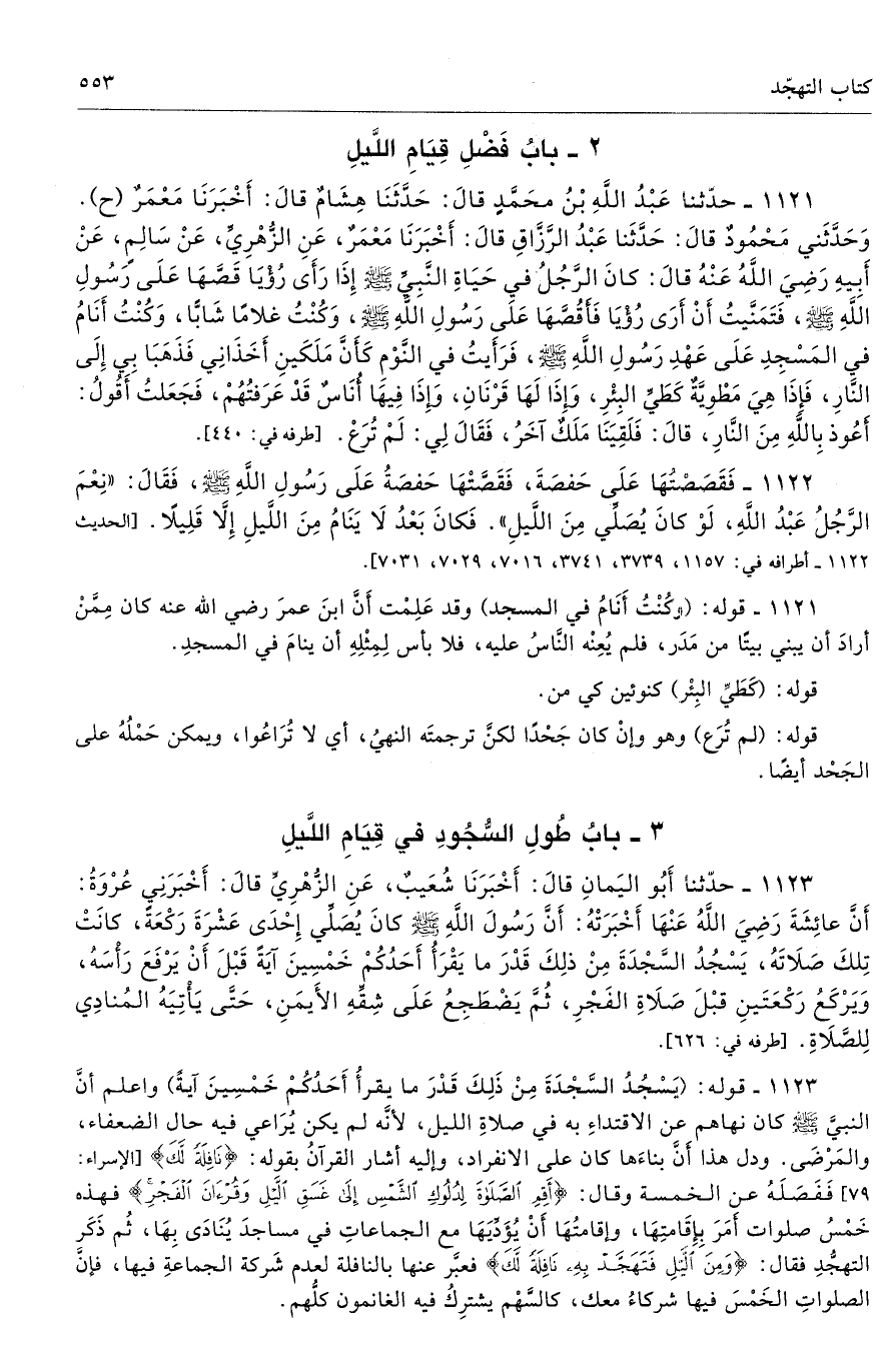 1122 - فَقَصَصْتُهَا عَلَى حَفْصَةَ فَقَصَّتْهَا حَفْصَةُ عَلَى رَسُولِ اللَّهِ - صلى الله عليه وسلم - فَقَالَ «نِعْمَ الرَّجُلُ عَبْدُ اللَّهِ، لَوْ كَانَ يُصَلِّى مِنَ اللَّيْلِ». فَكَانَ بَعْدُ لاَ يَنَامُ مِنَ اللَّيْلِ إِلاَّ قَلِيلاً. أطرافه 1157، 3739، 3741، 7016، 7029، 7031 - تحفة 15805