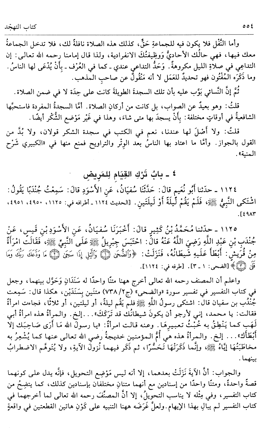 1125 - حَدَّثَنَا مُحَمَّدُ بْنُ كَثِيرٍ قَالَ أَخْبَرَنَا سُفْيَانُ عَنِ الأَسْوَدِ بْنِ قَيْسٍ عَنْ جُنْدَبِ بْنِ عَبْدِ اللَّهِ - رضى الله عنه - قَالَ احْتَبَسَ جِبْرِيلُ - صلى الله عليه وسلم - عَلَى النَّبِىِّ - صلى الله عليه وسلم - فَقَالَتِ امْرَأَةٌ مِنْ قُرَيْشٍ أَبْطَأَ عَلَيْهِ شَيْطَانُهُ. فَنَزَلَتْ {وَالضُّحَى (1) وَاللَّيْلِ إِذَا سَجَى (2) مَا وَدَّعَكَ رَبُّكَ وَمَا قَلَى (3)} [الضحى: 1 - 3]. أطرافه 1124، 4950، 4951، 4983 - تحفة 3249