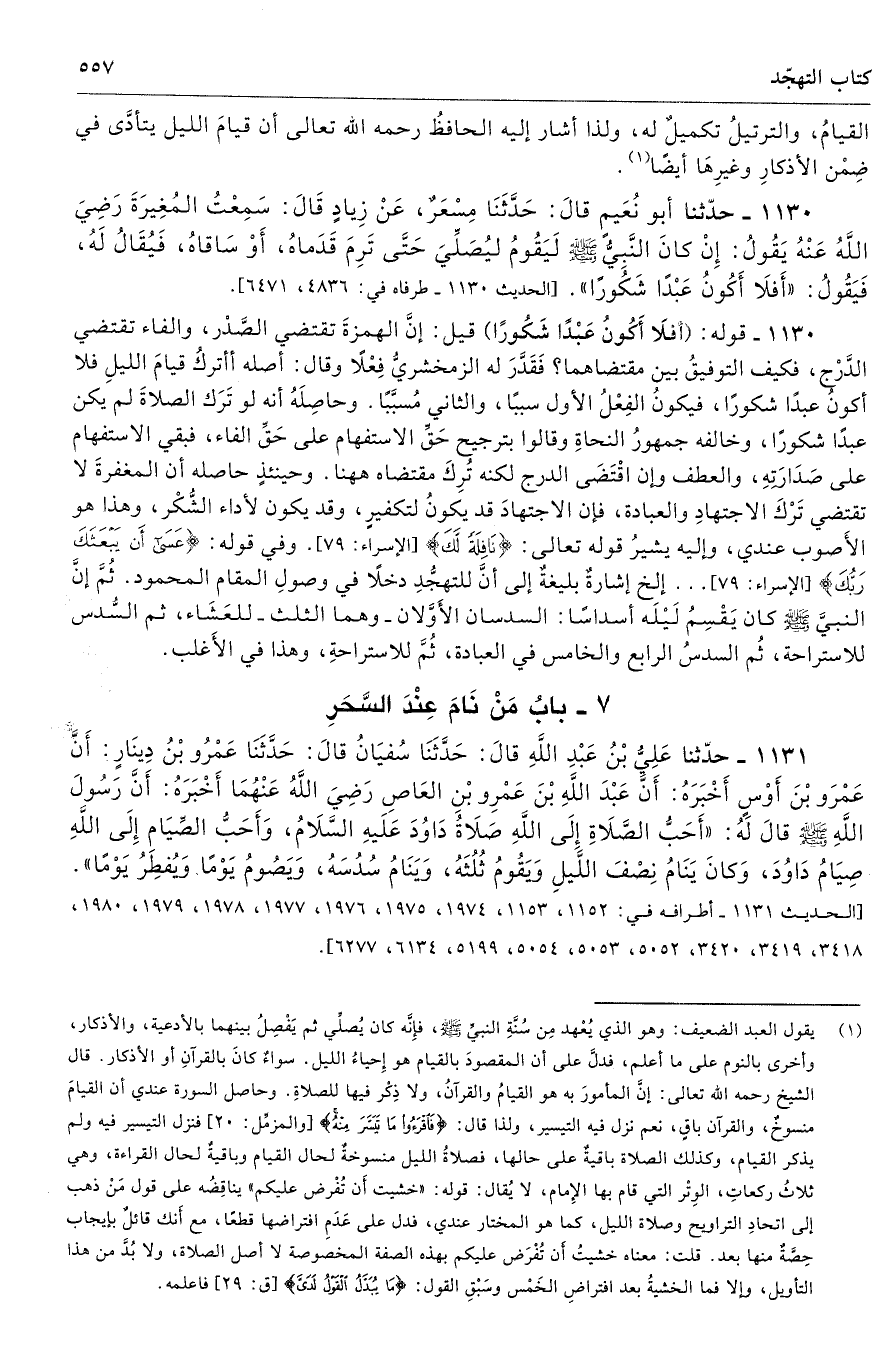 1130 - حَدَّثَنَا أَبُو نُعَيْمٍ قَالَ حَدَّثَنَا مِسْعَرٌ عَنْ زِيَادٍ قَالَ سَمِعْتُ الْمُغِيرَةَ - رضى الله عنه - يَقُولُ إِنْ كَانَ النَّبِىُّ - صلى الله عليه وسلم - لَيَقُومُ لِيُصَلِّىَ حَتَّى تَرِمُ قَدَمَاهُ أَوْ سَاقَاهُ، فَيُقَالُ لَهُ فَيَقُولُ «أَفَلاَ أَكُونُ عَبْدًا شَكُورًا». طرفاه 4836، 6471 - تحفة 11498