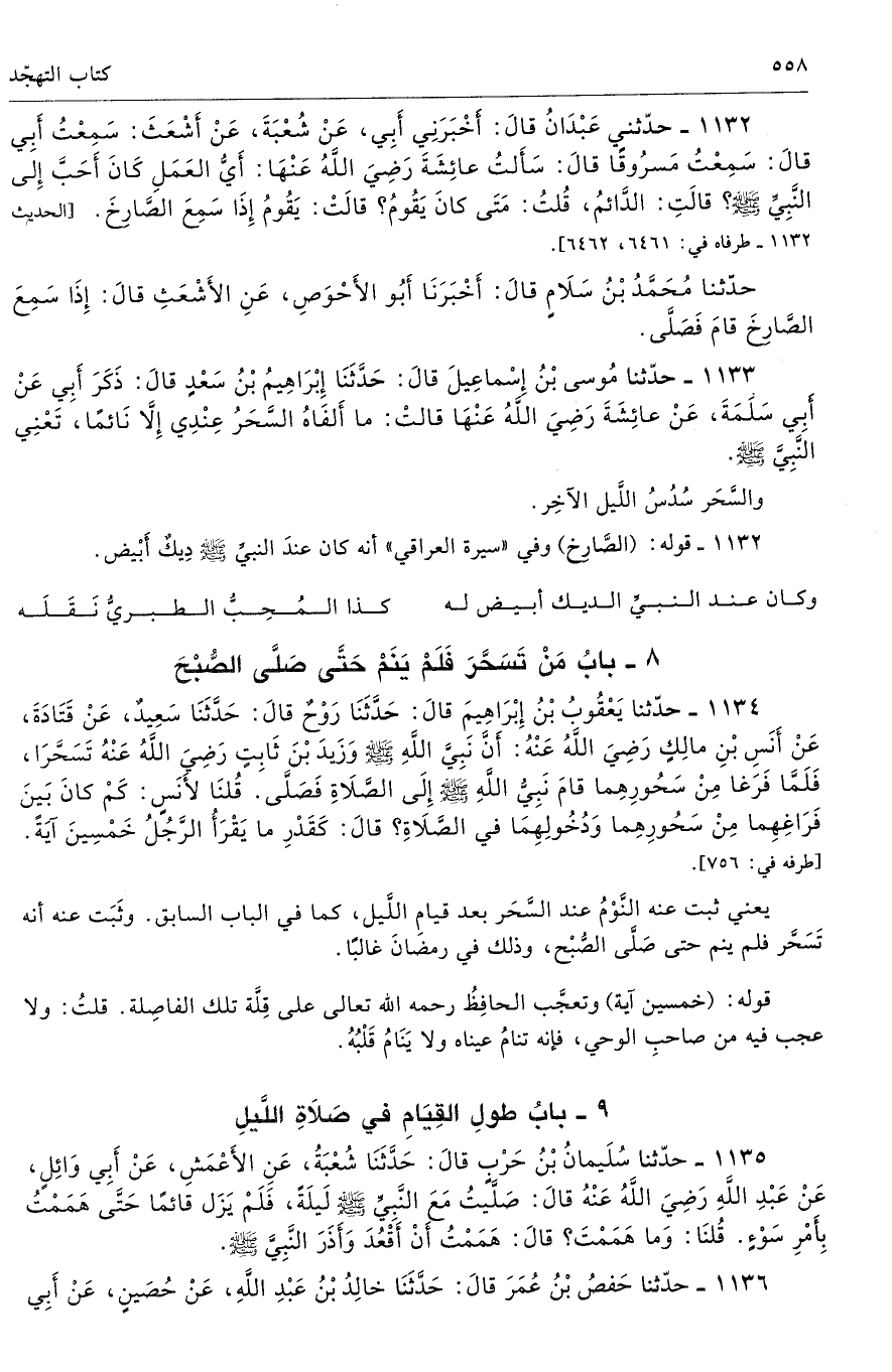1135 - حَدَّثَنَا سُلَيْمَانُ بْنُ حَرْبٍ قَالَ حَدَّثَنَا شُعْبَةُ عَنِ الأَعْمَشِ عَنْ أَبِى وَائِلٍ عَنْ عَبْدِ اللَّهِ - رضى الله عنه - قَالَ صَلَّيْتُ مَعَ النَّبِىِّ - صلى الله عليه وسلم - لَيْلَةً، فَلَمْ يَزَلْ قَائِمًا حَتَّى هَمَمْتُ بِأَمْرِ سَوْءٍ. قُلْنَا وَمَا هَمَمْتَ قَالَ هَمَمْتَ أَنْ أَقْعُدَ وَأَذَرَ النَّبِىَّ - صلى الله عليه وسلم -. تحفة 9249