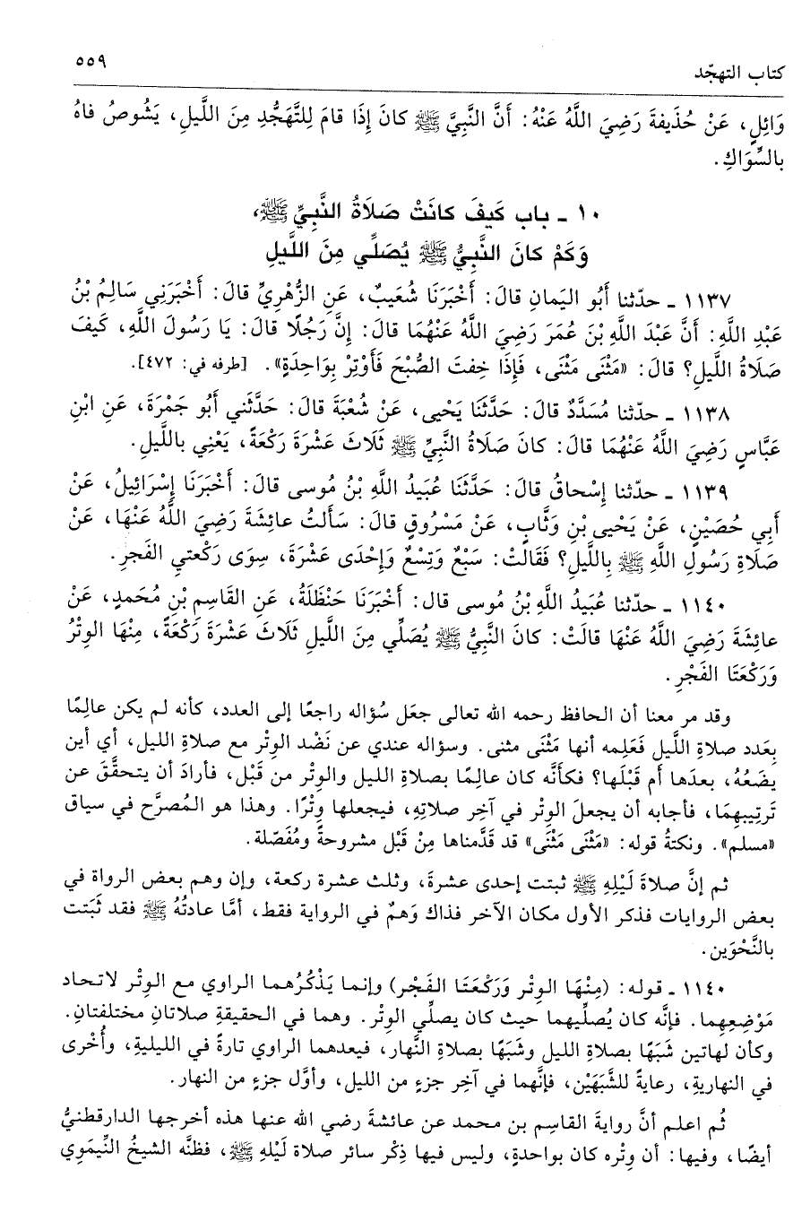 1137 - حَدَّثَنَا أَبُو الْيَمَانِ قَالَ أَخْبَرَنَا شُعَيْبٌ عَنِ الزُّهْرِىِّ قَالَ أَخْبَرَنِى سَالِمُ بْنُ عَبْدِ اللَّهِ أَنَّ عَبْدَ اللَّهِ بْنَ عُمَرَ - رضى الله عنهما - قَالَ إِنَّ رَجُلاً قَالَ يَا رَسُولَ اللَّهِ، كَيْفَ صَلاَةُ اللَّيْلِ قَالَ «مَثْنَى مَثْنَى، فَإِذَا خِفْتَ الصُّبْحَ فَأَوْتِرْ بِوَاحِدَةٍ». أطرافه 472، 473، 990، 993، 995 - تحفة 6843