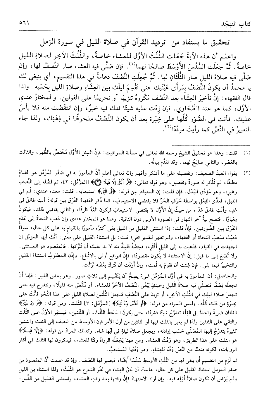 واعلم أن هذه الآيةَ جَعَلت الثُّلُثَ الأوَّل للعشاء خاصةً، والثُّلُبَ الآخِر لصلاةِ الليل خاصةً. ثُمَّ جعَلَت السُّدُسَ الأَوْسَطَ صالحًا لهما (¬1). فإن صَلَّى فيه العشاء صار النِّصفُ لها، وإن صَلَّى فيه صلاةَ الليل صار الثُّلُثَانِ لها. ثُمَّ جَعَلَتْ النِّصْفَ دعامةً في هذا التقسيم، أي ينبغي لك يا محمدُ أن يكونَ النِّصْفُ بِمَرأَى عَيْنَيك حتى تَقْسِمَ ليلَك بين العِشَاءِ وصلاةِ الليل بِحَسَبه. ولذا قال الفقهاء: إنَّ تأخيرَ العِشَاء بعد النِّصْف مَكْروهٌ تنزيهًا أو تحريمًا على القولين. والمختارُ عندي الأوَّل، كما هو عند الطَّحَاوي. فإن زِدْت عليه شيئًا فلك فيه خيرٌ، وإن انتقَصْت منه فلا بأسَ عليك. فأنت في الصُّوَرَ كُلِّها على خِيَرة بعد أن يكون النِّصْفُ ملحوظًا في ذِهْنِك، ولذا جاء التعبيرُ في النَّصِّ كما رأيتَ مردِّدًا (¬2).