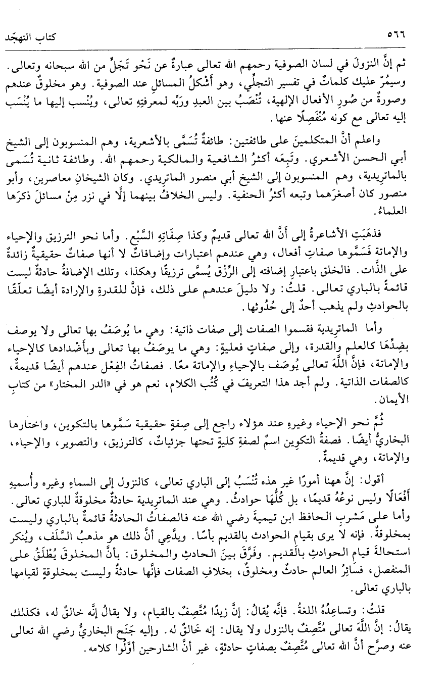 أقول: إنَّ ههنا أمورًا غير هذه تُنْسَبُ إلى الباري تعالى، كالنزول إلى السماءِ وغيره أُسمِّيةِ أَفْعَالا وليس نوعُهُ قديمًا، بل كُلُّهَا حوادثُ. وهي عند الماتُرِيدية حادثةٌ مخلوقةٌ للباري تعالى. وأما على مَشربِ الحافظ ابن تيميةَ رضي الله عنه فالصفاتُ الحادثةُ قائمةٌ بالباري وليست بمخلوقةٌ. فإنه لا يرى بقيامِ الحوادث بالقديم بأسًا. ويدَّعِي أنَّ ذلك هو مذهبُ السَّلَف، ويُنكر استحالةَ قيامِ الحوادثِ بالقديم. وفَرَّقَ بينَ الحادثِ والمخلوق: بأنَّ المخلوقَ يُطْلَقُ على المنفصل، فسائِرُ العالمَ حادثٌ ومخلوقٌ، بخلافِ الصفات فإنَّها حادثةٌ وليست بمخلوقةٍ لقيامها بالباري تعالى.
