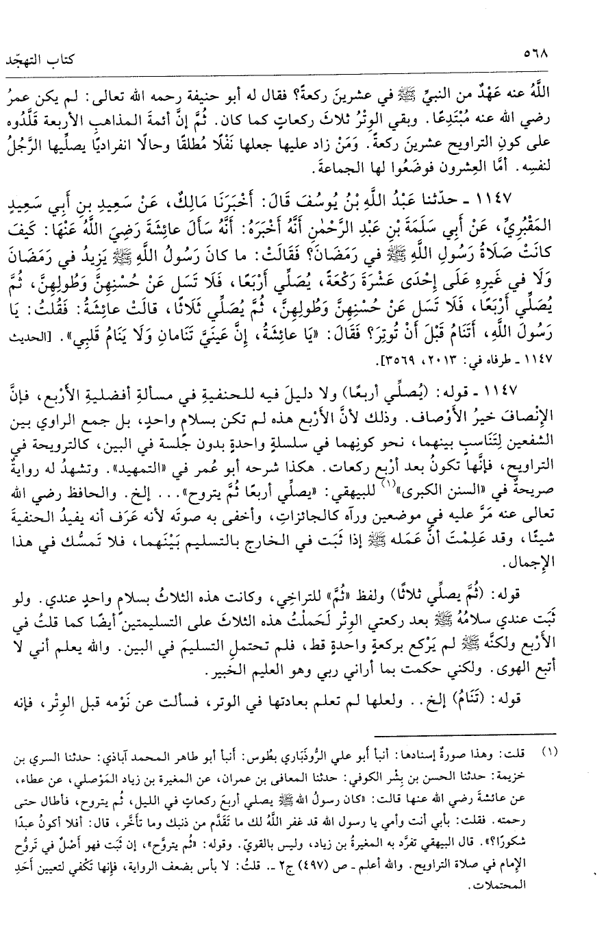 1147 - قوله: (يُصلِّي أربعًا) ولا دليلَ فيه للحنفيةِ في مسألةِ أفضليةِ الأَرْبع، فإنَّ الإِنْصافَ خيرُ الأَوْصاف. وذلك لأنَّ الأَرْبع هذه لم تكن بسلامٍ واحدٍ، بل جمع الراوي بين الشفعين لِتَنَاسبٍ بينهما، نحو كونِهما في سلسلةٍ واحدةٍ بدون جلسة في البين، كالترويحة في التراويح، فإنَّها تكونُ بعد أرْبع ركعات. هكذا شرحه أبو عُمر في «التمهيد». وتشهدُ له رواثةٌ صريحةُ في «السنن الكبرى» (¬1) للبيهقي: «يصلِّي أربعًا ثُمَّ يتروح» ... إلخ. والحافظ رضي الله تعالى عنه مَرَّ عليه في موضعين ورآه كالجائزاتِ، وأخفى بهع صوتَه لأنه عَرَف أنه يفيدُ الحنفيةَ شيئًا، وقد عَلِمْتَ أنَّ عَمَله صلى الله عليه وسلّم إذا ثَبَت في الخارج بالتسليم بَيْنَهما، فلا تُمسُّك في هذا الإِجمال.
