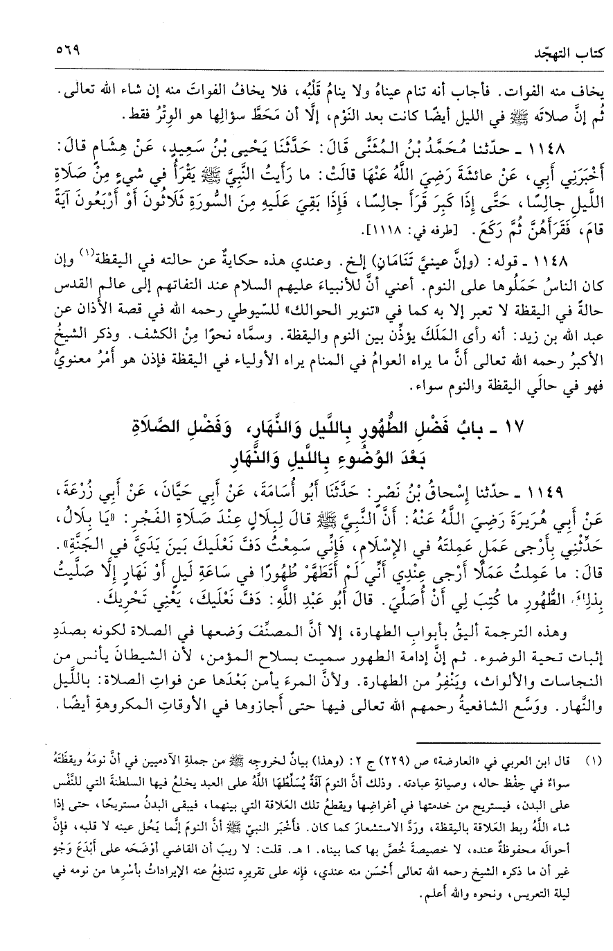 1148 - قوله: (وإنَّ عينيَّ تَنَامَانِ) إلخ. وعندي هذه حكايةٌ عن حالته في اليقظة (¬1) وإن كان الناسُ حَمَلُوها على النوم. أعني أنَّ للأنبياءَ عليهم السلام عند التفاتهم إلى عالم القدس حالةً في اليقظة لا تعبر إلا به كما في «تنوير الحوالك» للسّيوطي رحمه الله في قصة الأَذان عن عبد الله بن زيد: أنه رأى المَلَكَ يؤذِّن بين النوم واليقظة. وسمَّاه نحوًا مِنْ الكشف. وذكر الشيخُ الأكبرُ رحمه الله تعالى أَنَّ ما يراه العوامُ في المنام يراه الأولياء في اليقظة فإذن هو أَمْرُ معنويُّ فهو في حالَي اليقظة والنوم سواء.