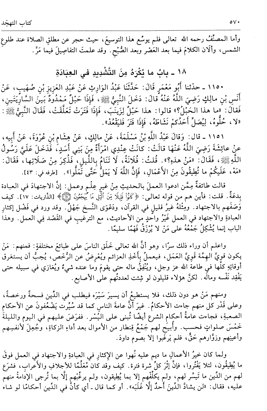 1150 - حَدَّثَنَا أَبُو مَعْمَرٍ حَدَّثَنَا عَبْدُ الْوَارِثِ عَنْ عَبْدِ الْعَزِيزِ بْنِ صُهَيْبٍ عَنْ أَنَسِ بْنِ مَالِكٍ - رضى الله عنه - قَالَ دَخَلَ النَّبِىُّ - صلى الله عليه وسلم - فَإِذَا حَبْلٌ مَمْدُودٌ بَيْنَ السَّارِيَتَيْنِ فَقَالَ «مَا هَذَا الْحَبْلُ». قَالُوا هَذَا حَبْلٌ لِزَيْنَبَ فَإِذَا فَتَرَتْ تَعَلَّقَتْ. فَقَالَ النَّبِىُّ - صلى الله عليه وسلم - «لاَ، حُلُّوهُ، لِيُصَلِّ أَحَدُكُمْ نَشَاطَهُ، فَإِذَا فَتَرَ فَلْيَقْعُدْ». تحفة 1033