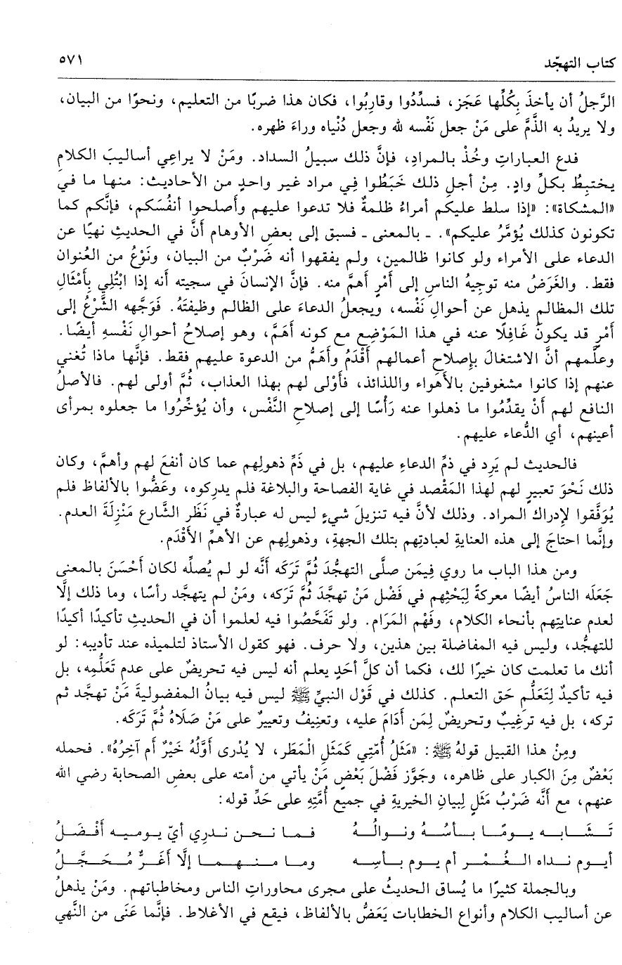 ومن هذا الباب ما روي فِيْمَن صلَّى التهجُّدَ ثُمَّ تَرَكَه أَنَّه لو لم يُصلِّه لكان أَحْسَنَ بالمعنى جَعَلَه الناسُ أيضًا معركةً لِبَحْثِهم في فَضْل مَنْ تهجَّدَ ثُمَّ تَرَكه، ومَنْ لم يتهجَّد رأسًا، وما ذلك إلا لعدم عنايتِهم بأنحاء الكلام، وفَهْم المَرَام. ولو تَفَحَّصُوا فيه لعلموا أن في الحديثِ تأكيدًا أكيدًا للتهجُّد، وليس فيه المفاضلة بين هذين، ولا حرف. فهو كقول الأستاذ لتلميذه عند تأديبه: لو أنك ما تعلمت كان خيرًا لك، فكما أن كلَّ أحَدٍ يعلم أنه ليس فيه تحريضٌ على عدمِ تَعَلُّمِه، بل فيه تأكيدٌ لِتَعَلُّمِ حَقَّ التعلم. كذلك في قَوْل النبيِّ صلى الله عليه وسلّم ليس فيه بيانُ المفضوليةَ مَنْ تهجَّد ثم تركه، بل فيه ترغِيبٌ وتحريضٌ لِمَن أَدَامَ عليه، وتعنِيفُ وتعبيرٌ على مَنْ صَلاهُ ثُمَّ تَرَكَه.