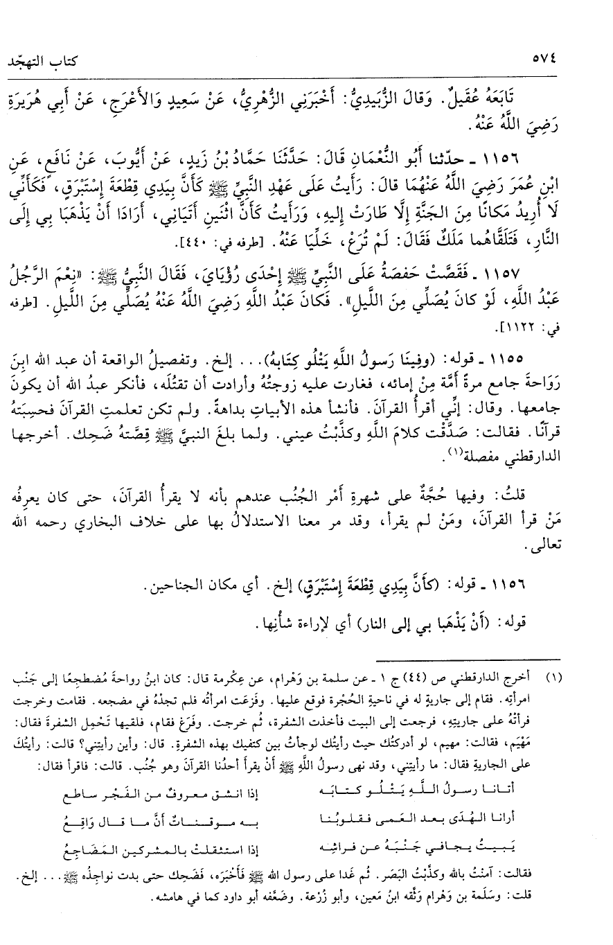1157 - فَقَصَّتْ حَفْصَةُ عَلَى النَّبِىِّ - صلى الله عليه وسلم - إِحْدَى رُؤْيَاىَ فَقَالَ النَّبِىُّ - صلى الله عليه وسلم - «نِعْمَ الرَّجُلُ عَبْدُ اللَّهِ لَوْ كَانَ يُصَلِّى مِنَ اللَّيْلِ». فَكَانَ عَبْدُ اللَّهِ - رضى الله عنه - يُصَلِّى مِنَ اللَّيْلِ. أطرافه 1122، 3739، 3741، 7016، 7029، 7031 - تحفة 15803