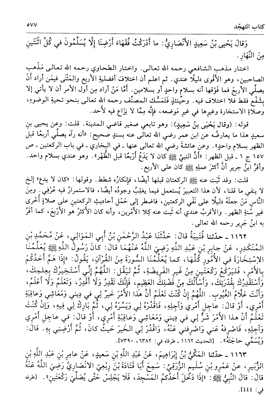 قوله: (وقال يَحْيَى بنُ سَعِيدٍ): وهو تابعي صغير قاضي المدينة. قلت: وعن يحيى بنِ سعيدٍ هذا ما يعارضُه عن ابن عمر رضي الله تعالى عنه بسندٍ صحيح: «أنه رآه يصلِّي أربعًا قبل الظهر بسلام واحدٍ». وعن عائشةَ رضي الله تعالى عنها - في البخاري - في باب الركعتين - ص 157 ج 1 - قبل الظهر: «أَنَّ النبيَّ صلى الله عليه وسلّم كان لا يَدَعُ أَرْبعًا قبل الظُّهْر». وهو عندي بسلام واحد. وأقرَّ ابنُ جرير أنَّ أكثرَ عملِهِ صلى الله عليه وسلّم كان على الأربع.