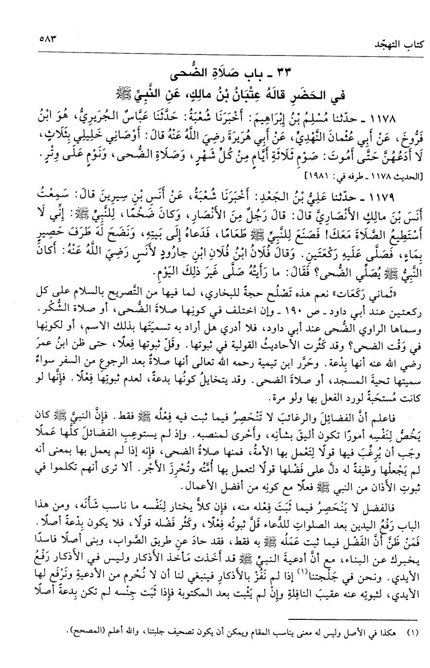 33 - باب صَلاَةِ الضُّحَى فِى الْحَضَرِ قَالَهُ عِتْبَانُ بْنُ مَالِكٍ عَنِ النَّبِىِّ - صلى الله عليه وسلم -