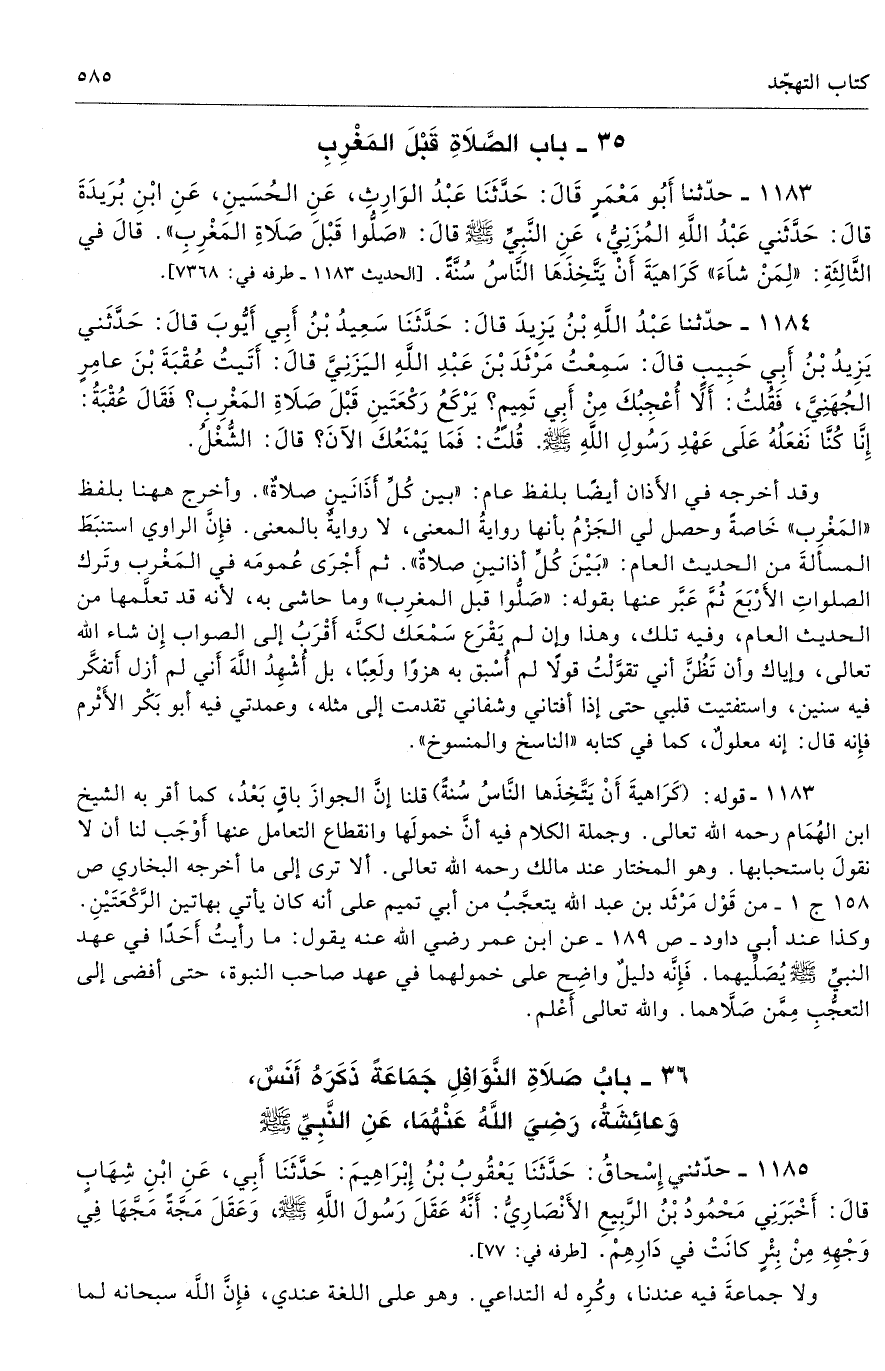 وقد أخرجه في الأَذان أيضًا بلفظ عام: «بين كُلِّ أَذَانَينِ صلاةٌ». وأخرج ههنا بلفظ «المَغْرِب» خَاصةً وحصل لي الجَزْمُ بأنها روايةُ المعنى، لا روايةٌ بالمعنى. فإِنَّ الراوي استنبَطَ المسألةَ من الحديث العام: «بَيْنَ كُلِّ أذانينِ صلاةٌ». ثم أَجْرَى عُمومَه في المَغْرب وتَرك الصلواتِ الأَرْبَعَ ثُمَّ عَبَّر عنها بقوله: «صَلُّوا قبل المغرِب» وما حاشى به، لأنه قد تعلَّمها من الحديث العام، وفيه تلك، وهذا وإن لم يَقْرَع سَمْعَك لكنَّه أَقْرَبُ إلى الصواب إِن شاء الله تعالى، وإياك وأن تَظُنَّ أني تقوَّلْتُ قولا لم أُسْبق به هزوًا ولَعِبًا، بل أُشْهِدَ اللَّهَ أَني لم أزل أَتفكَّر فيه سنين، واستفتيت قلبي حتى إذا أفتاني وشفاني تقدمت إلى مثله، وعمدتي فيه أبو بَكْر الأَثْرم فإِنه قال: إنه معلولٌ، كما في كتابه «الناسخ والمنسوخ».