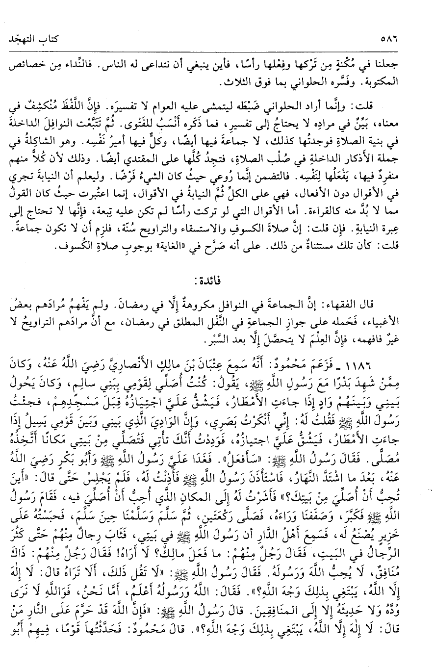 1186 - فَزَعَمَ مَحْمُودٌ أَنَّهُ سَمِعَ عِتْبَانَ بْنَ مَالِكٍ الأَنْصَارِىَّ - رضى الله عنه - وَكَانَ مِمَّنْ شَهِدَ بَدْرًا مَعَ رَسُولِ اللَّهِ - صلى الله عليه وسلم - يَقُولُ كُنْتُ أُصَلِّى لِقَوْمِى بِبَنِى سَالِمٍ، وَكَانَ يَحُولُ بَيْنِى وَبَيْنَهُمْ وَادٍ إِذَا جَاءَتِ الأَمْطَارُ فَيَشُقُّ عَلَىَّ اجْتِيَازُهُ قِبَلَ مَسْجِدِهِمْ، فَجِئْتُ رَسُولَ اللَّهِ - صلى الله عليه وسلم - فَقُلْتُ لَهُ إِنِّى أَنْكَرْتُ بَصَرِى، وَإِنَّ الْوَادِىَ الَّذِى بَيْنِى وَبَيْنَ قَوْمِى يَسِيلُ إِذَا جَاءَتِ الأَمْطَارُ فَيَشُقُّ عَلَىَّ اجْتِيَازُهُ، فَوَدِدْتُ أَنَّكَ تَأْتِى فَتُصَلِّى مِنْ بَيْتِى مَكَانًا أَتَّخِذُهُ مُصَلًّى. فَقَالَ رَسُولُ اللَّهِ - صلى الله عليه وسلم - «سَأَفْعَلُ». فَغَدَا عَلَىَّ رَسُولُ اللَّهِ - صلى الله عليه وسلم - وَأَبُو بَكْرٍ - رضى الله عنه - بَعْدَ مَا اشْتَدَّ النَّهَارُ فَاسْتَأْذَنَ رَسُولُ اللَّهِ - صلى الله عليه وسلم - فَأَذِنْتُ لَهُ فَلَمْ يَجْلِسْ حَتَّى قَالَ «أَيْنَ تُحِبُّ أَنْ أُصَلِّىَ مِنْ بَيْتِكَ». فَأَشَرْتُ لَهُ إِلَى الْمَكَانِ الَّذِى أُحِبُّ أَنْ أُصَلِّىَ فِيهِ، فَقَامَ رَسُولُ اللَّهِ - صلى الله عليه وسلم - فَكَبَّرَ وَصَفَفْنَا وَرَاءَهُ، فَصَلَّى رَكْعَتَيْنِ، ثُمَّ سَلَّمَ وَسَلَّمْنَا حِينَ سَلَّمَ، فَحَبَسْتُهُ عَلَى خَزِيرٍ يُصْنَعُ لَهُ فَسَمِعَ أَهْلُ الدَّارِ رَسُولَ اللَّهِ - صلى الله عليه وسلم - فِى بَيْتِى فَثَابَ رِجَالٌ مِنْهُمْ حَتَّى كَثُرَ الرِّجَالُ فِى الْبَيْتِ. فَقَالَ رَجُلٌ مِنْهُمْ مَا فَعَلَ مَالِكٌ لاَ أَرَاهُ. فَقَالَ رَجُلٌ مِنْهُمْ ذَاكَ مُنَافِقٌ لاَ يُحِبُّ اللَّهَ وَرَسُولَهُ. فَقَالَ رَسُولُ اللَّهِ - صلى الله عليه وسلم - «لاَ تَقُلْ ذَاكَ أَلاَ تَرَاهُ قَالَ لاَ إِلَهَ إِلاَّ اللَّهُ.