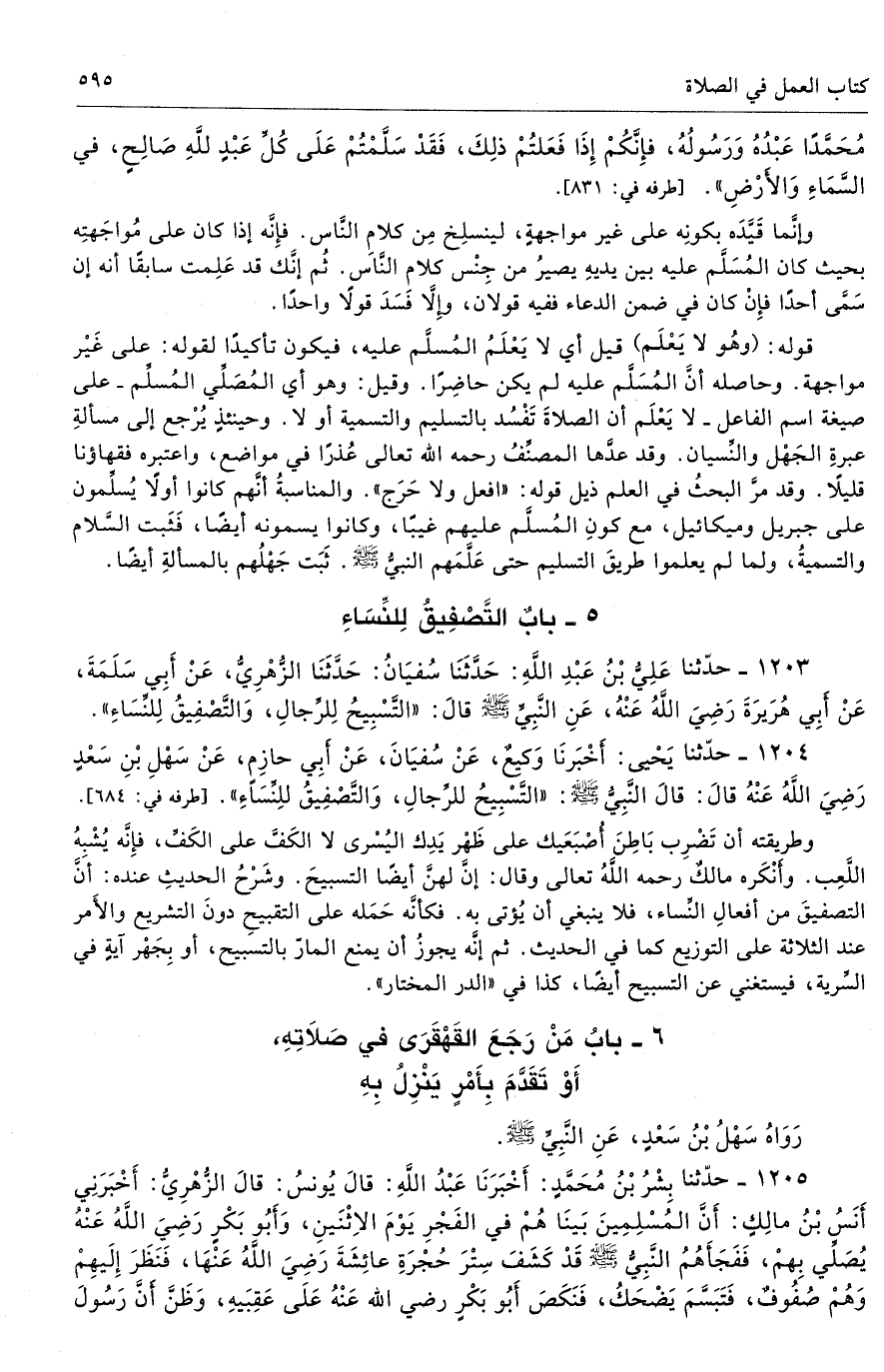 1204 - حَدَّثَنَا يَحْيَى أَخْبَرَنَا وَكِيعٌ عَنْ سُفْيَانَ عَنْ أَبِى حَازِمٍ عَنْ سَهْلِ بْنِ سَعْدٍ - رضى الله عنه - قَالَ قَالَ النَّبِىُّ - صلى الله عليه وسلم - «التَّسْبِيحُ لِلرِّجَالِ وَالتَّصْفِيحُ لِلنِّسَاءِ». أطرافه 684، 1201، 1218، 1234، 2690، 2693، 7190 - تحفة 4686