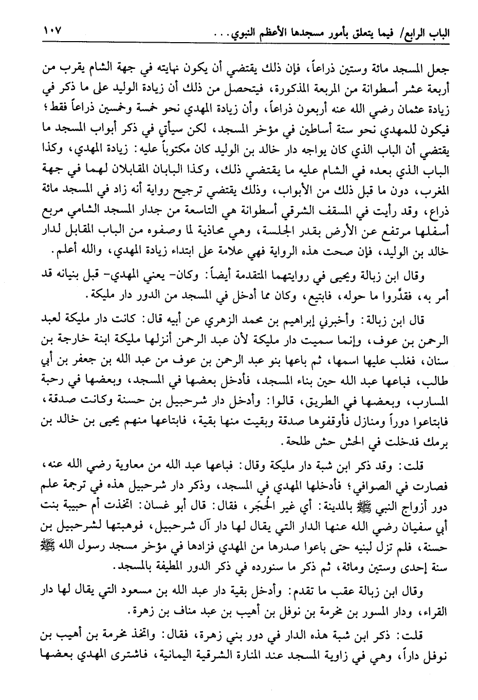 قلت: ما روياه من أنه زاد في مؤخر المسجد مائة ذراع يخالفه ما تقدم في زيادة الوليد أنه جعل طوله مائتي ذراع؛ لأنه يقتضي أن يكون طول المسجد بعد زيادة المهدي ثلاثمائة ذراع، وطول المسجد اليوم على ما صرح به ابن زبالة مائتا ذراع وأربعون ذراعا، وقد اختبرته فزاد على ذلك ثلاثة عشر ذراعا كما سيأتي، ومع ذلك فهو مؤيد لما قدمناه من الاحتمال المتبادر إلى الفهم في الرواية المتقدمة في زيادة الوليد المقتضي لأن نهاية المسجد من جهة الشام في زمنه كانت بعد أربع عشر أسطوانة من مربعة القبر، ومنها إلى آخر المسجد أربع وعشرون أسطوانة فإذا أسقطنا من ذلك أربع عشرة للوليد بقي عشرة أساطين وقدرها نحو مائة ذراع، وهذا معنى قوله في الرواية المتقدمة «وذلك عشر أساطين في صحن المسجد إلى سقائف النساء» أي إلى آخر سقائف النساء، وهي المسقف الشامي، وقوله «وخمس في السقائف» أي من العشرة المذكورة، مع أنه يقتضي أن المهدي جعل المسقف المذكور خمس أساطين، وهذا كان في ذلك الزمان كما سنوضحه، وهو اليوم أربع فقط، وقد قدمنا ترجيح أن المراد مما ذكر في زيادة الوليد أنه جعل أربع فقط، وقد قدمنا ترجيح طأن المراد مما ذكر في زيادة الولدي أنه جعل أربع عشرة أسطوانة في الرحبة بما فيها من أربع أساطين في السقائف التي كانت أولا، وأنه جعل السقائف الشامية في زمنه بعد الأربع عشرة المذكورة؛ لموافقة ما ذكره في ذرع المسجد في زمنه ولما ذكر في زيادة عثمان رضي الله عنه من أنه