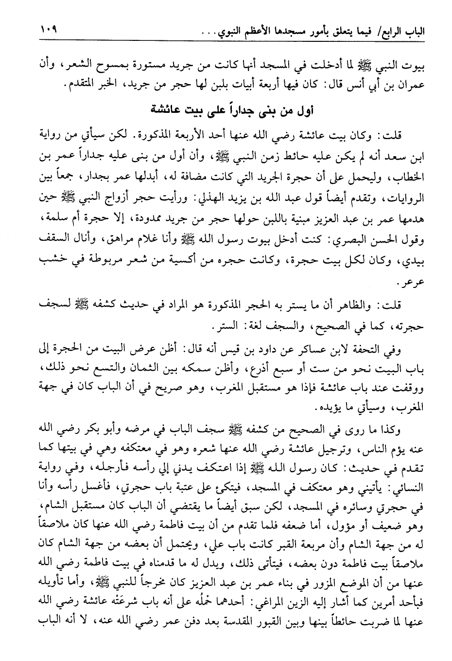 قد قدمنا أن النبي صلّى الله عليه وسلّم لما بنى المسجد بنى بيتين لزوجتيه عائشة وسودة رضي الله عنهما على نعت بناء المسجد من لبن وجريد النخل، قال ابن النجار: وكان لبيت عائشة رضي الله عنها مصراع واحد من عرعر أو ساج، وتقدم أيضا في الفصل التاسع عن جماعة ممن أدرك