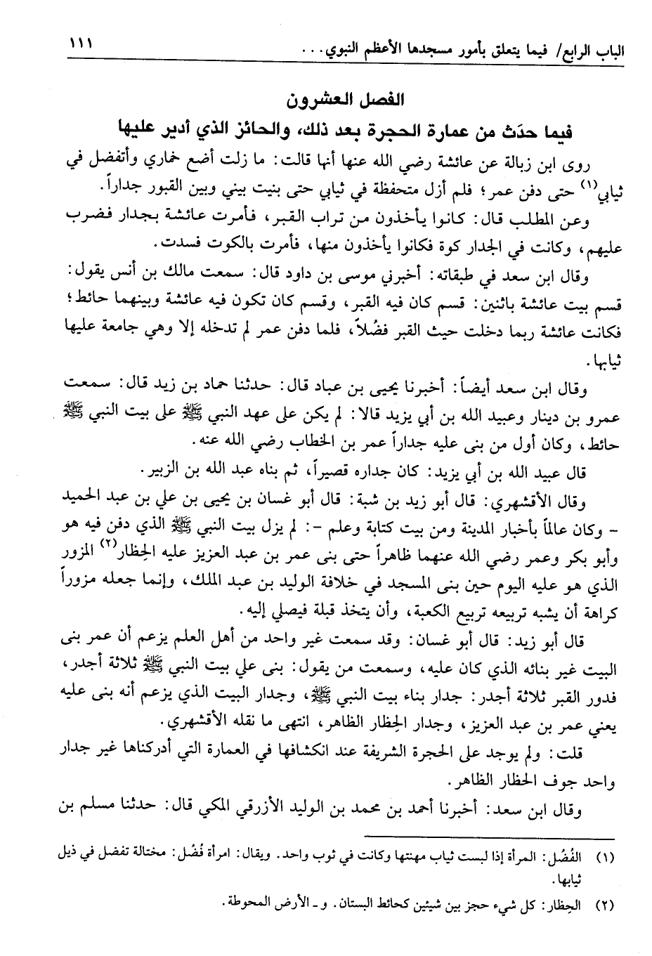 هذا ما تحصل لي من كلام متقدمي المؤرخين، خلاف ما اقتضاه كلام متأخريهم، من أن جدار الحجرة الذي [في] جوف الحائز الدائر عليها اليوم هو جدارها الأول، وإليه ينتهي حد المسجد، وأن جدار الحائز الذي جعله عمر بن عبد العزيز إنما جعله فيما يلي الحجرة من المسجد، وقد قدمنا من كلام ابن زبالة والمحاسبي نقلا عن مالك ما يرد ذلك، والله أعلم.