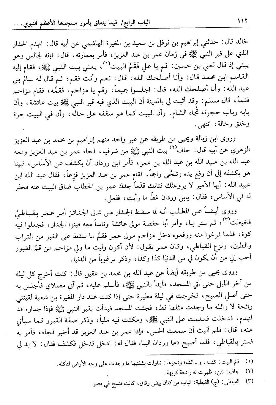 قال أبو زيد: قال أبو غسان: وقد سمعت غير واحد من أهل العلم يزعم أن عمر بنى البيت غير بنائه الذي كان عليه، وسمعت من يقول: بنى علي بيت النبي صلّى الله عليه وسلّم ثلاثة أجدر، فدور القبر ثلاثة أجدر: جدار بناء بيت النبي صلّى الله عليه وسلّم، وجدار البيت الذي يزعم أنه بنى عليه يعني عمر بن عبد العزيز، وجدار الحظار الظاهر، انتهى ما نقله الأقشهري.