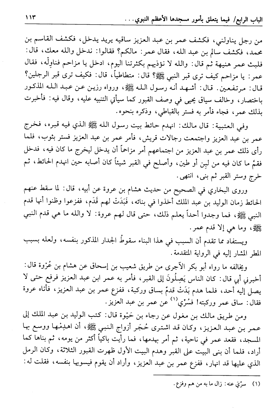 وروى ابن زبالة ويحيى من طريقه عن غير واحد منهم إبراهيم بن محمد بن عبد العزيز الزهري عن أبيه قال: جاف «2» بيت النبي صلّى الله عليه وسلّم من شرقيه، فجاء عمر بن عبد العزيز ومعه عبد الله بن عبيد الله بن عبد الله بن عمر، فأمر ابن وردان أن يكشف عن الأساس، فبينا هو يكشفه إلى أن رفع يده وتنحّى واجما، فقام عمر بن عبد العزيز فزعا، فقال عبد الله ابن عبيد الله: أيها الأمير لا يروعنّك فتانك قدما جدك عمر بن الخطاب ضاق البيت عنه فحفر له في الأساس، فقال: يابن وردان غطّ ما رأيت، ففعل.