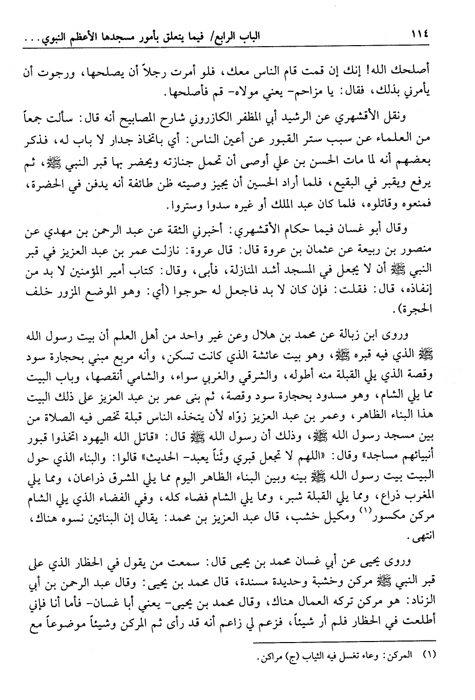 وفي العتبية: قال مالك: انهدم حائط بيت رسول الله صلّى الله عليه وسلّم الذي فيه قبره، فخرج عمر بن عبد العزيز واجتمعت رجالات قريش، فأمر عمر بن عبد العزيز فستر بثوب، فلما رأى ذلك عمر بن عبد العزيز من اجتماعهم أمر مزاحما أن يدخل ليخرج ما كان فيه، فدخل فقمّ ما كان فيه من لبن أو طين، وأصلح في القبر شيئا كان أصابه حين انهدم الحائط، ثم خرج وستر القبر ثم بنى، انتهى.