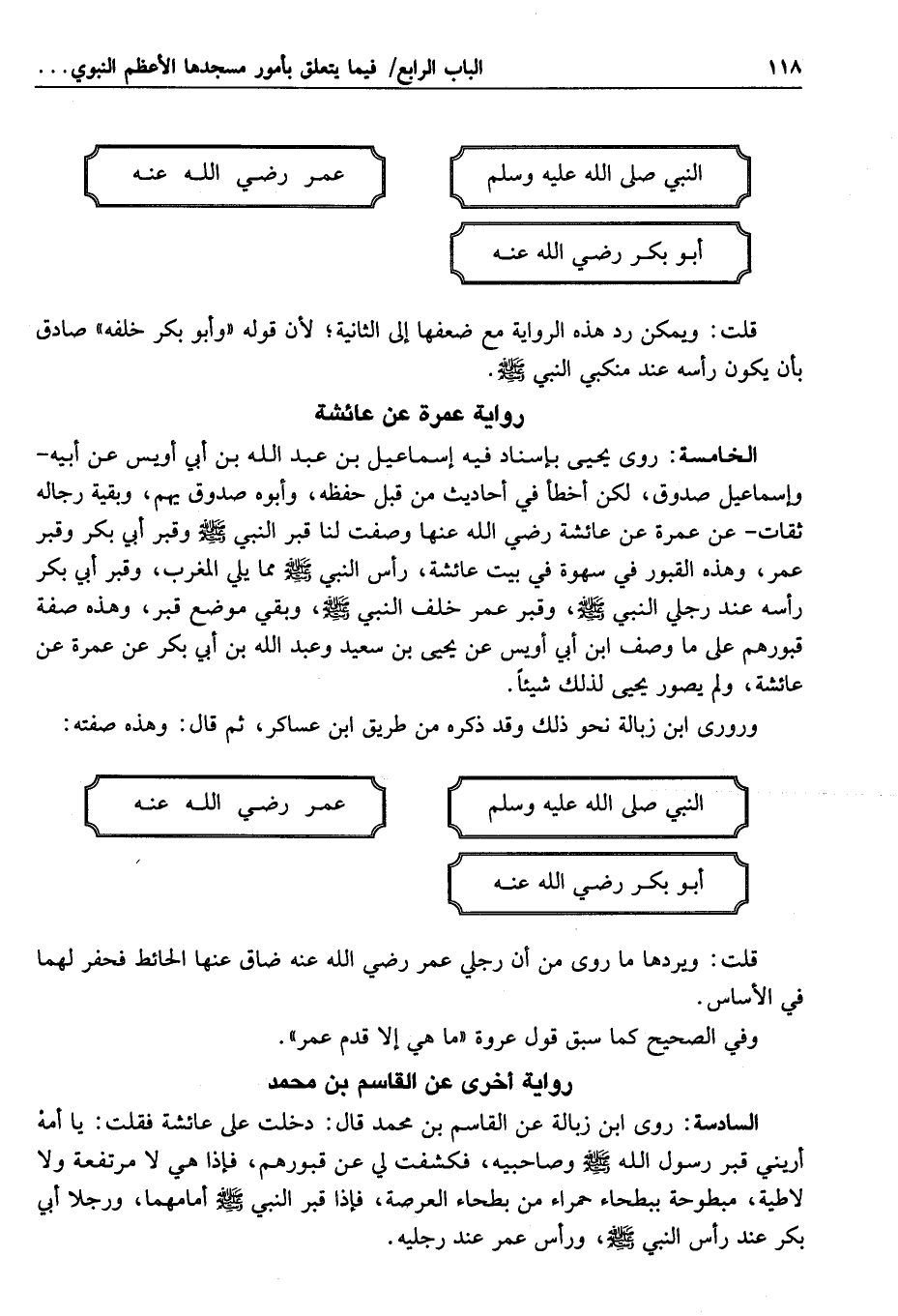 النبي صلّى الله عليه وسلم أبو بكر رضي الله عنه عمر رضي الله عنه قلت: وابن زبالة ضعيف، وإسحاق بن عيسى هو ابن بنت داود بن أبي هند، صدوق يخطئ، وعثمان بن نسطاس عن عثيم مصغر بن نسطاس بكسر النون المدني أخو عبيد مولى آل كثير بن الصلت، مقبول حيث يتابع، وإلا فليّن الحديث. وقد ذكر الحافظ بن حجر أن أبا بكر الآجري روى هذا الخبر في كتاب صفة قبر النبي صلّى الله عليه وسلّم من طريق إسحاق بن عيسى المذكور عن ابن نسطاس، وليس فيه ذكر تصوير، ولم يذكر الحافظ ابن حجر الواسطة بين الآجري وإسحاق بن عيسى، وهذه الرواية مع ما فيها من الضعف قابلة للتأويل بردها إلى الرواية التي قبلها، وإن كان التصوير يأباه؛ لجواز حمله على التقريب، والله أعلم.