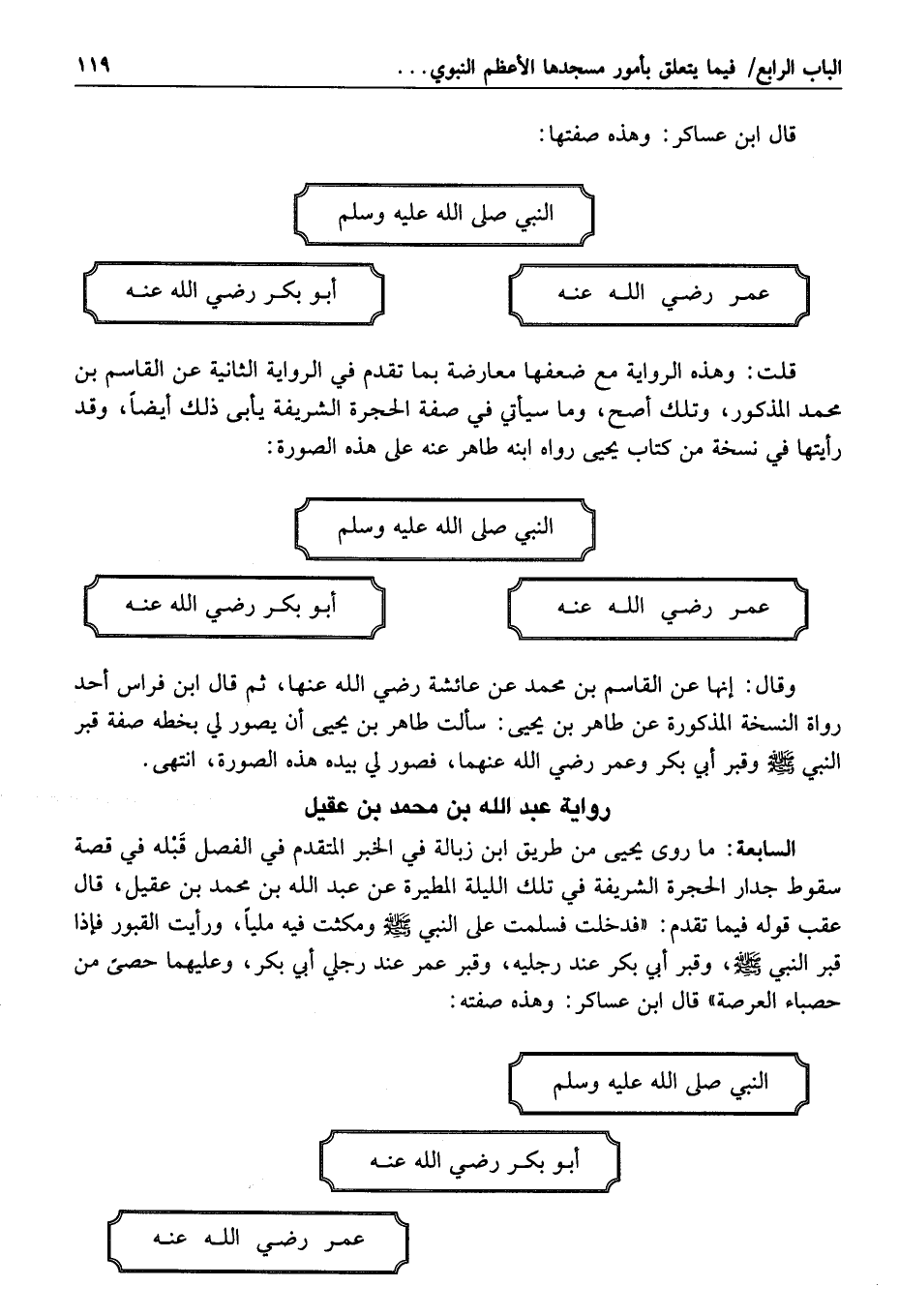 الخامسة: روى يحيى بإسناد فيه إسماعيل بن عبد الله بن أبي أويس عن أبيه- وإسماعيل صدوق، لكن أخطأ في أحاديث من قبل حفظه، وأبوه صدوق يهم، وبقية رجاله ثقات- عن عمرة عن عائشة رضي الله عنها وصفت لنا قبر النبي صلّى الله عليه وسلّم وقبر أبي بكر وقبر عمر، وهذه القبور في سهوة في بيت عائشة، رأس النبي صلّى الله عليه وسلّم مما يلي المغرب، وقبر أبي بكر رأسه عند رجلي النبي صلّى الله عليه وسلّم، وقبر عمر خلف النبي صلّى الله عليه وسلّم، وبقي موضع قبر، وهذه صفة قبورهم على ما وصف ابن أبي أويس عن يحيى بن سعيد وعبد الله بن أبي بكر عن عمرة عن عائشة، ولم يصور يحيى لذلك شيئا.