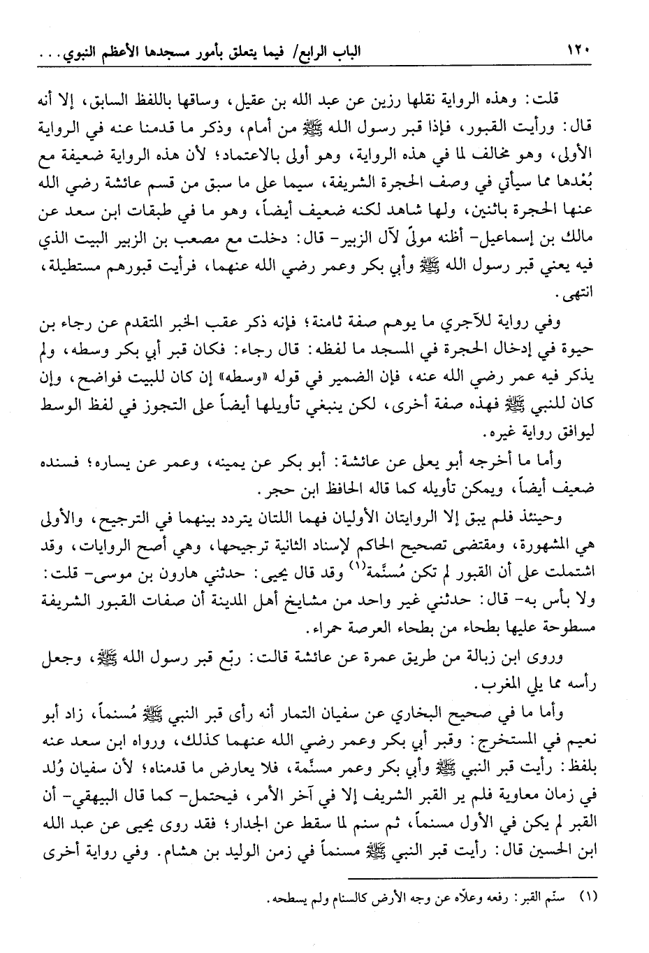 النبي صلّى الله عليه وسلم عمر رضي الله عنه أبو بكر رضي الله عنه وقال: إنها عن القاسم بن محمد عن عائشة رضي الله عنها، ثم قال ابن فراس أحد رواة النسخة المذكورة عن طاهر بن يحيى: سألت طاهر بن يحيى أن يصور لي بخطه صفة قبر النبي صلّى الله عليه وسلّم وقبر أبي بكر وعمر رضي الله عنهما، فصور لي بيده هذه الصورة، انتهى.
