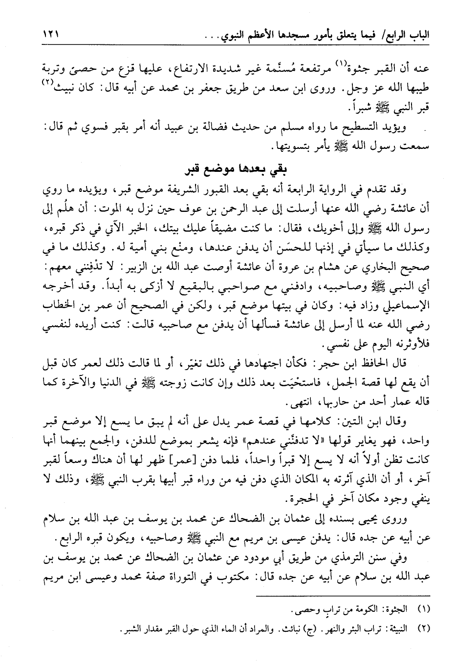 وحينئذ فلم يبق إلا الروايتان الأوليان فهما اللتان يتردد بينهما في الترجيح، والأولى هي المشهورة، ومقتضى تصحيح الحاكم لإسناد الثانية ترجيحها، وهي أصح الروايات، وقد اشتملت على أن القبور لم تكن مسنّمة «1» وقد قال يحيى: حدثني هارون بن موسى- قلت: