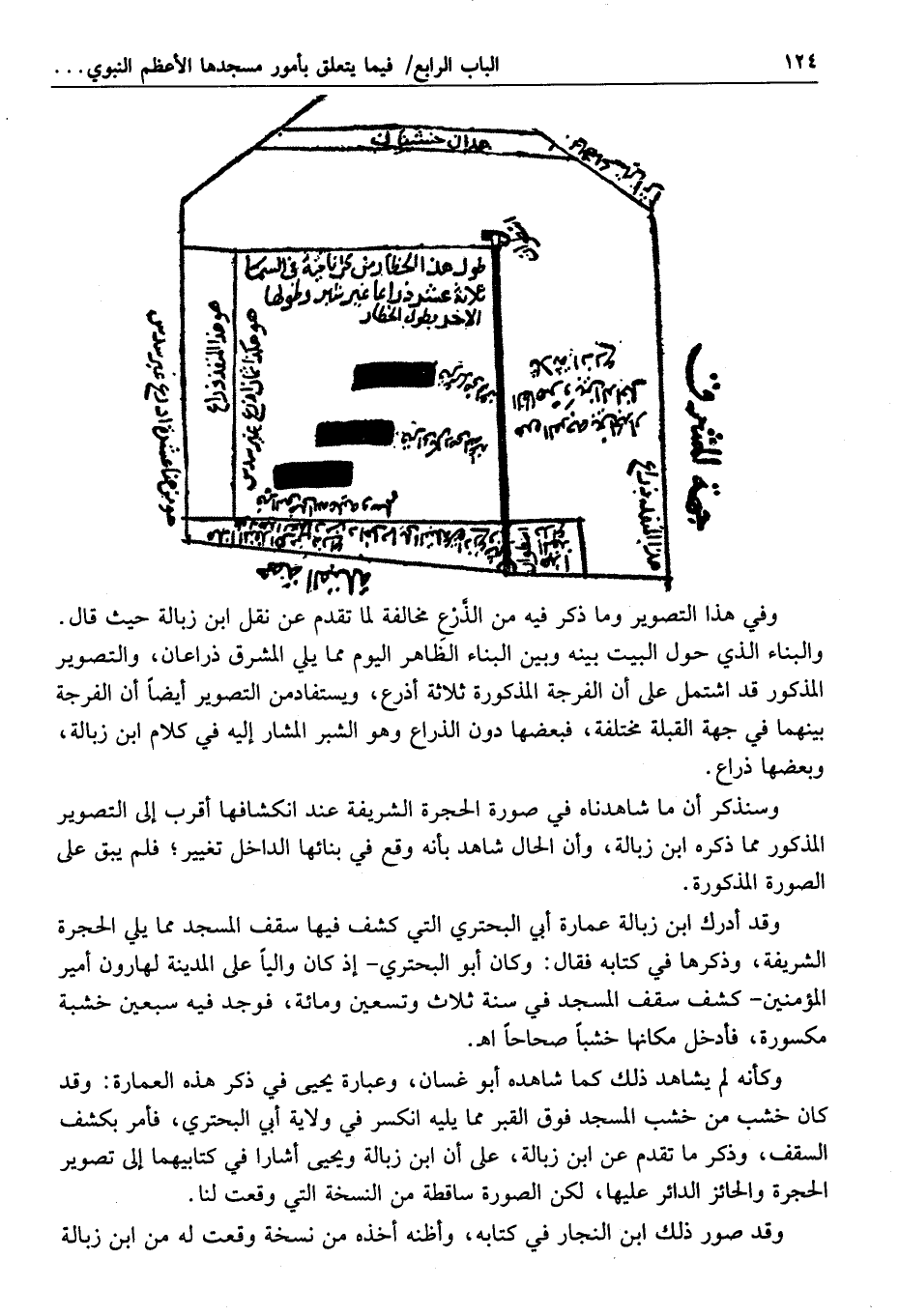 وأما الحظار الظاهر والبيت الذي فيه فإني اطلعت فيه من بين سقفي المسجد حتى عاينت ذلك الحظار الذي على البيت وما فيه، وصورته وما فيه، وذرعته على ما فيه من الذرع، وذلك حين انكسر خشب سقف المسجد فكشف السقف من تلك الناحية لعمارته، وأبو البحتري بن وهب بن رشد يومئذ على المدينة، وذلك في جمادى الأولى من سنة ثلاث وتسعين ومائة.