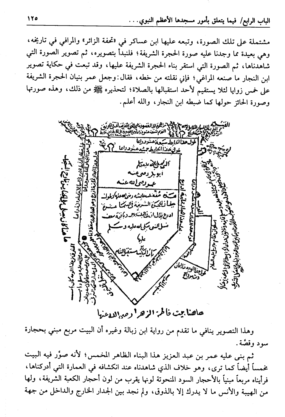 وسنذكر أن ما شاهدناه في صورة الحجرة الشريفة عند انكشافها أقرب إلى التصوير المذكور مما ذكره ابن زبالة، وأن الحال شاهد بأنه وقع في بنائها الداخل تغيير؛ فلم يبق على الصورة المذكورة.