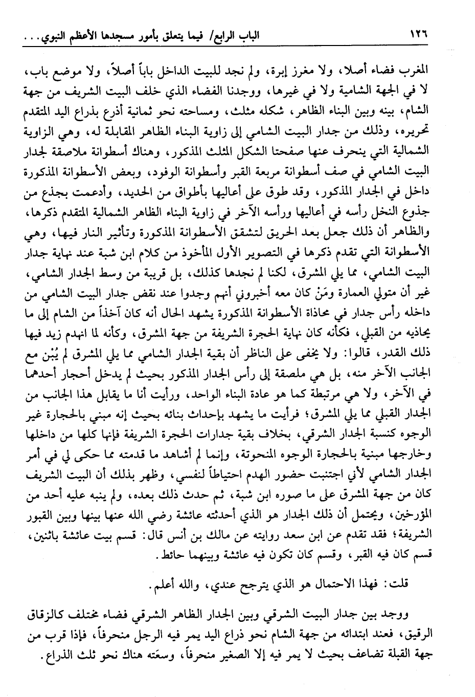 ثم بنى عليه عمر بن عبد العزيز هذا البناء الظاهر المخمس؛ لأنه صوّر فيه البيت مخمسا أيضا كما ترى، وهو خلاف الذي شاهدناه عند انكشافه في العمارة التي أدركناها، فرأيناه مربعا مبنيا بالأحجار السود المنحوتة لونها يقرب من لون أحجار الكعبة الشريفة، ولها من الهيبة والأنس ما لا يدرك إلا بالذوق، ولم نجد بين الجدار الخارج والداخل من جهة