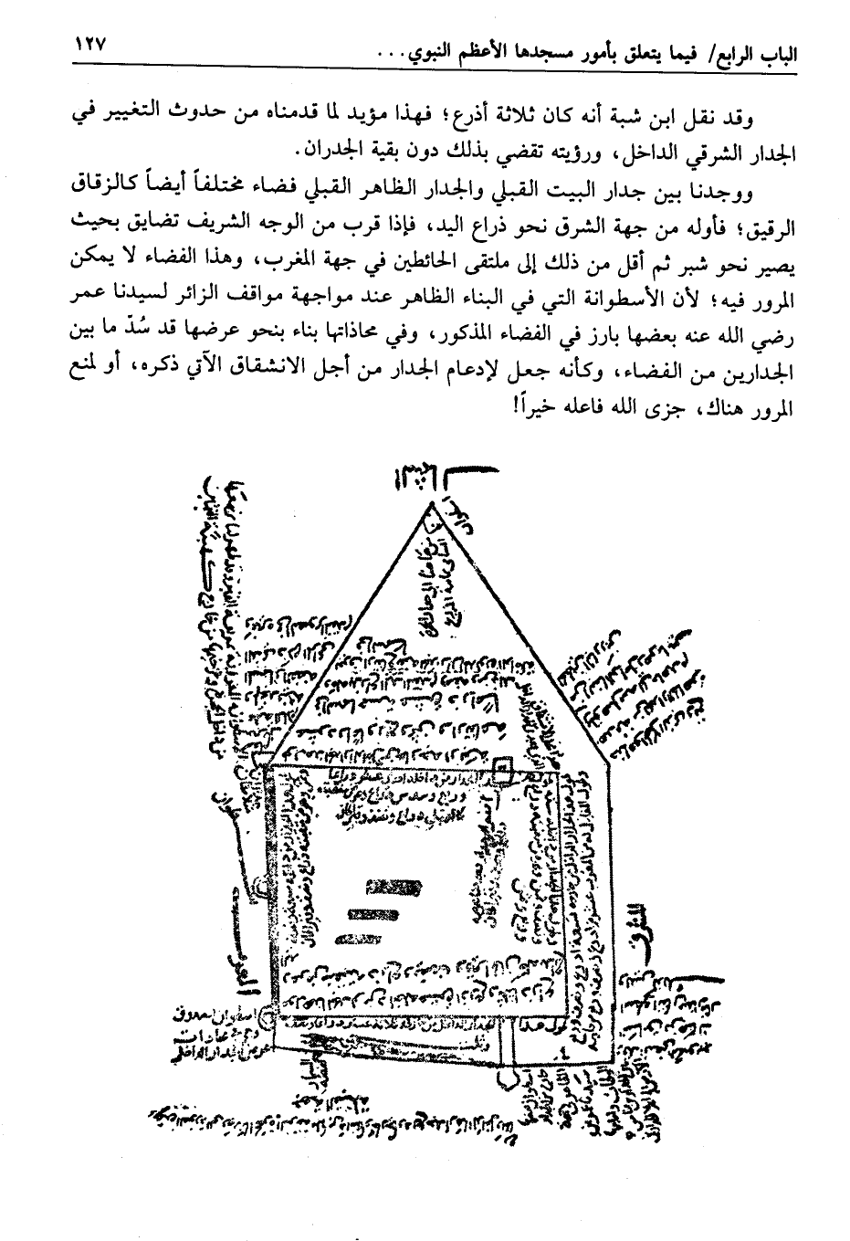 المغرب فضاء أصلا، ولا مغرز إبرة، ولم نجد للبيت الداخل بابا أصلا، ولا موضع باب، لا في الجهة الشامية ولا في غيرها، ووجدنا الفضاء الذي خلف البيت الشريف من جهة الشام، بينه وبين البناء الظاهر، شكله مثلث، ومساحته نحو ثمانية أذرع بذراع اليد المتقدم تحريره، وذلك من جدار البيت الشامي إلى زاوية البناء الظاهر المقابلة له، وهي الزاوية الشمالية التي ينحرف عنها صفحتا الشكل المثلث المذكور، وهناك أسطوانة ملاصقة لجدار البيت الشامي في صف أسطوانة مربعة القبر وأسطوانة الوفود، وبعض الأسطوانة المذكورة داخل في الجدار المذكور، وقد طوق على أعاليها بأطواق من الحديد، وأدعمت بجذع من جذوع النخل رأسه في أعاليها ورأسه الآخر في زاوية البناء الظاهر الشمالية المتقدم ذكرها، والظاهر أن ذلك جعل بعد الحريق لتشقق الأسطوانة المذكورة وتأثير النار فيها، وهي الأسطوانة التي تقدم ذكرها في التصوير الأول المأخوذ من كلام ابن شبة عند نهاية جدار البيت الشامي، مما يلي المشرق، لكنا لم نجدها كذلك، بل قريبة من وسط الجدار الشامي، غير أن متولي العمارة ومن كان معه أخبروني أنهم وجدوا عند نقض جدار البيت الشامي من داخله رأس جدار في محاذاة الأسطوانة المذكورة يشهد الحال أنه كان آخذا من الشام إلى ما يحاذيه من القبلي، فكأنه كان نهاية الحجرة الشريفة من جهة المشرق، وكأنه لما انهدم زيد فيها ذلك القدر، قالوا: ولا يخفى على الناظر أن بقية الجدار الشامي مما يلي المشرق لم يبن مع الجانب الآخر منه، بل هي ملصقة إلى رأس الجدار المذكور بحيث لم يدخل أحجار أحدهما في الآخر، ولا هي مرتبطة كما هو عادة البناء الواحد، ورأيت أنا ما يقابل هذا الجانب من الجدار القبلي مما يلي المشرق؛ فرأيت ما يشهد بإحداث بنائه بحيث إنه مبني بالحجارة غير الوجوه كنسبة الجدار الشرقي، بخلاف بقية جدارات الحجرة الشريفة فإنها كلها من داخلها وخارجها مبنية بالحجارة الوجوه المنحوتة، وإنما لم أشاهد ما قدمته مما حكى لي في أمر الجدار الشامي لأني اجتنبت حضور الهدم احتياطا لنفسي، وظهر بذلك أن البيت الشريف كان من جهة المشرق على ما صوره ابن شبة، ثم حدث ذلك بعده، ولم ينبه عليه أحد من المؤرخين، ويحتمل أن ذلك الجدار هو الذي أحدثته عائشة رضي الله عنها بينها وبين القبور الشريفة؛ فقد تقدم عن ابن سعد روايته عن مالك بن أنس قال: قسم بيت عائشة باثنين، قسم كان فيه القبر، وقسم كان تكون فيه عائشة وبينهما حائط.