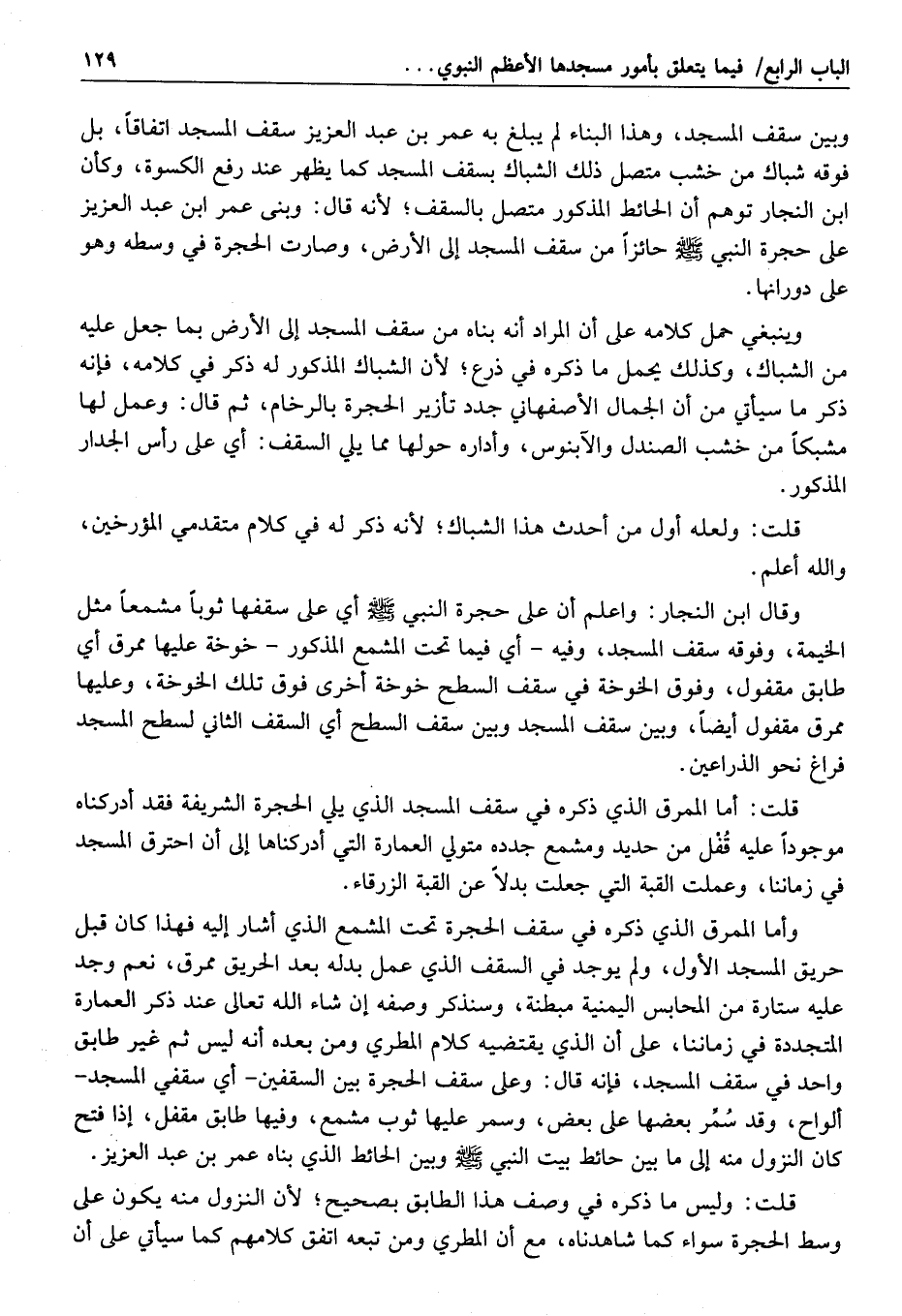 وطول الجدار المنعطف من الجدار المذكور عند الزاوية المذكورة إلى الزاوية الشمالية نحو أربعة عشر ذراعا، وفيما ذكرناه من الذرع في الثلاثة الجدر الأخيرة مخالفة لما تقدم في تصوير ابن النجار ومن تبعه.