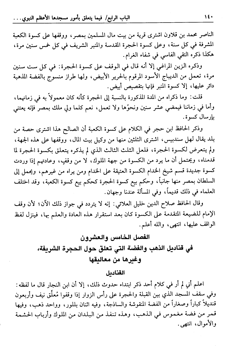 وهو يقتضي أن ابن أبي الهيجاء أول من كسا الحجرة في خلافة المستضيء بأمر الله، وكانت خلافته في سنة ست وستين وخمسمائة، ومات سنة خمس وسبعين وخمسمائة، وفي كلام رزين ما يقتضي مخالفته؛ فإنه قال في ضمن كلام نقله عن محمد بن إسماعيل ما لفظه: